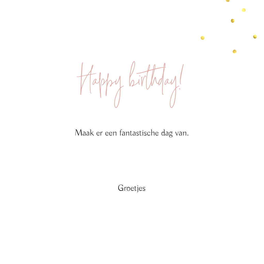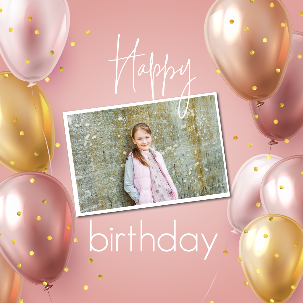 Wat een feestje om te sturen: deze feestelijke verjaardagskaart voor een meisje. Op dit kaartje staan roze en gouden ballonnen naast een foto van de trotse jarige.