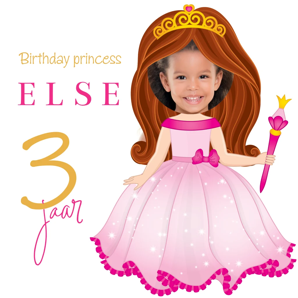 Prinsessen verjaardagskaart met foto. In dit voorbeeld is de leeftijd 3 jaar gebruikt, maar deze kun je met een paar klikken aanpassen naar een ander getal. Zo is deze kaart ook voor een andere leeftijd te gebruiken. Vervang de foto voor een eigen persoonlijke foto en pas de naam van de jarige prinses aan.