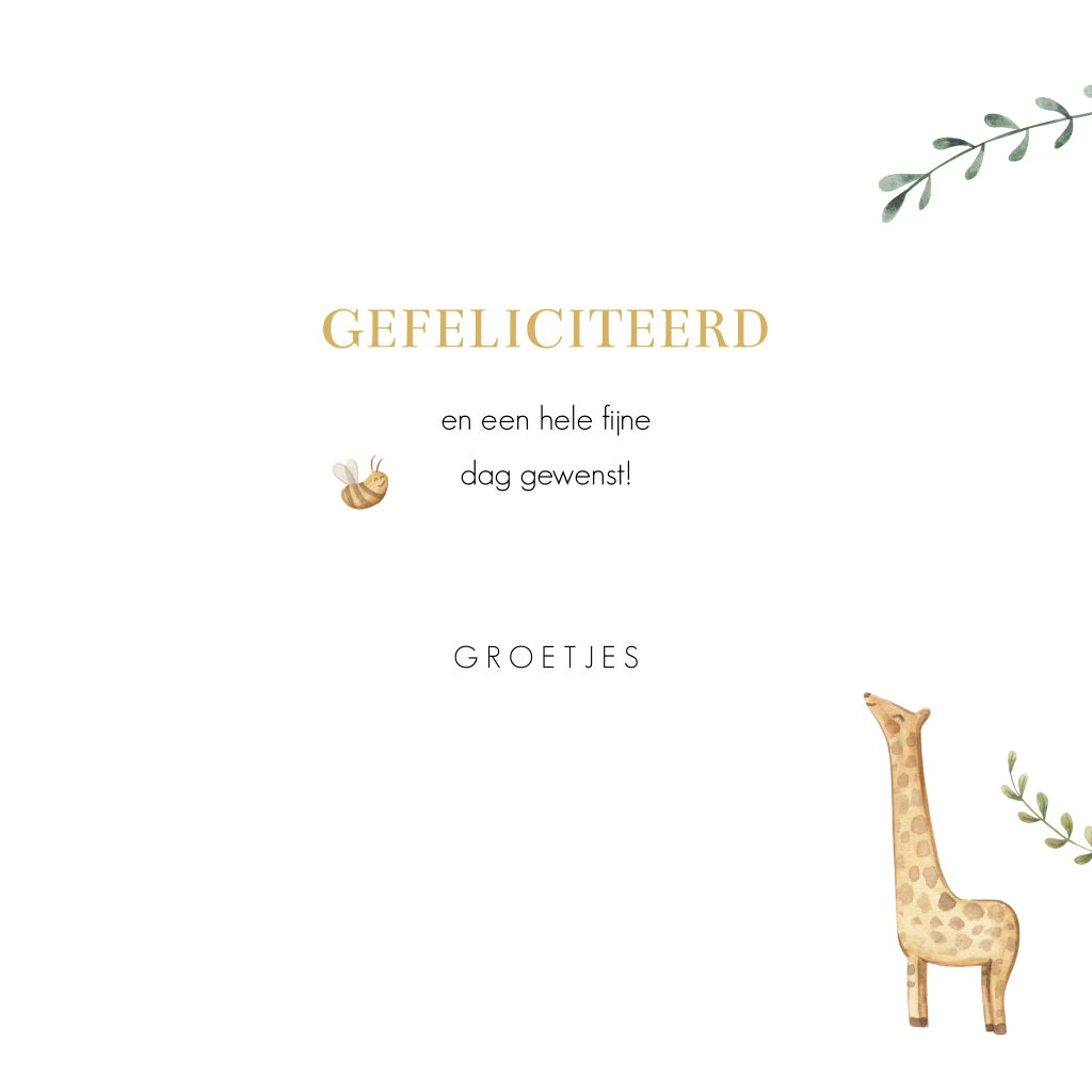 Lief felicitatie kaartje voor een jongen met vrolijke dieren, waaronder een olifantje, konijntje, giraffe, bij en vlinder. De naam van de jarige staat groot op de voorzijde van deze kaart en kun je zelf gemakkelijk aanpassen.