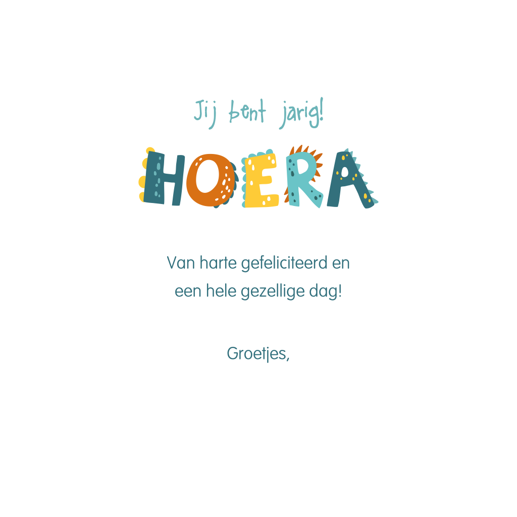 Hoera, er is er één jarig! Stuur de jarige deze verjaardagskaart met de tekst "Hoera" in kleurrijke dino-stijl met daaronder de naam van het feestbeest, de leeftijd en een lachende dino. De bloemetjes en pootafdrukken maken het kaartje helemaal af.