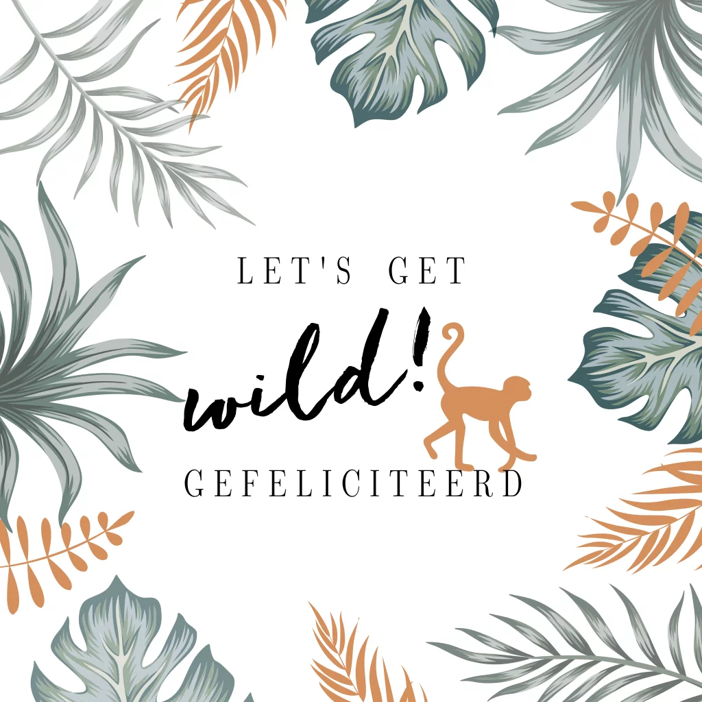 Let's get wild! Feliciteer de jarige met deze leuke junglekaart. Op deze verjaardagskaart verschillende bladeren in botanische stijl en een klein aapje.