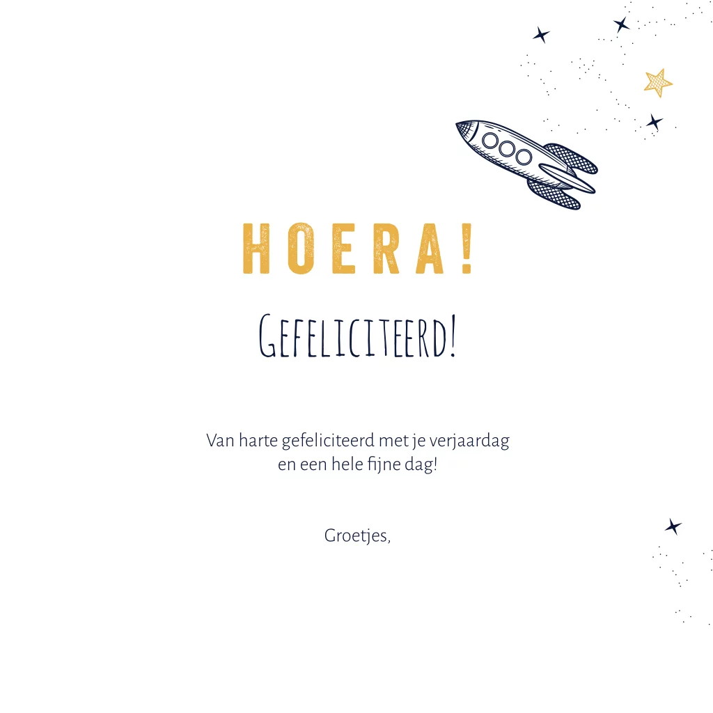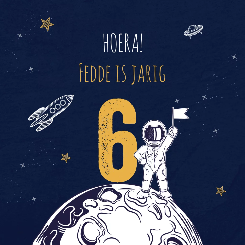 Kinder verjaardagskaart in ruimtevaart thema met astronaut op de maan. Gebruik de naam en de leeftijd van de jarige om er een mooie persoonlijke felicitatiekaart van te maken. De teksten en de leeftijd kun je zelf gemakkelijk aanpassen.