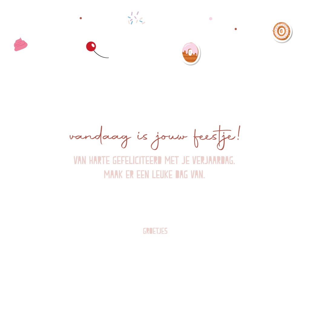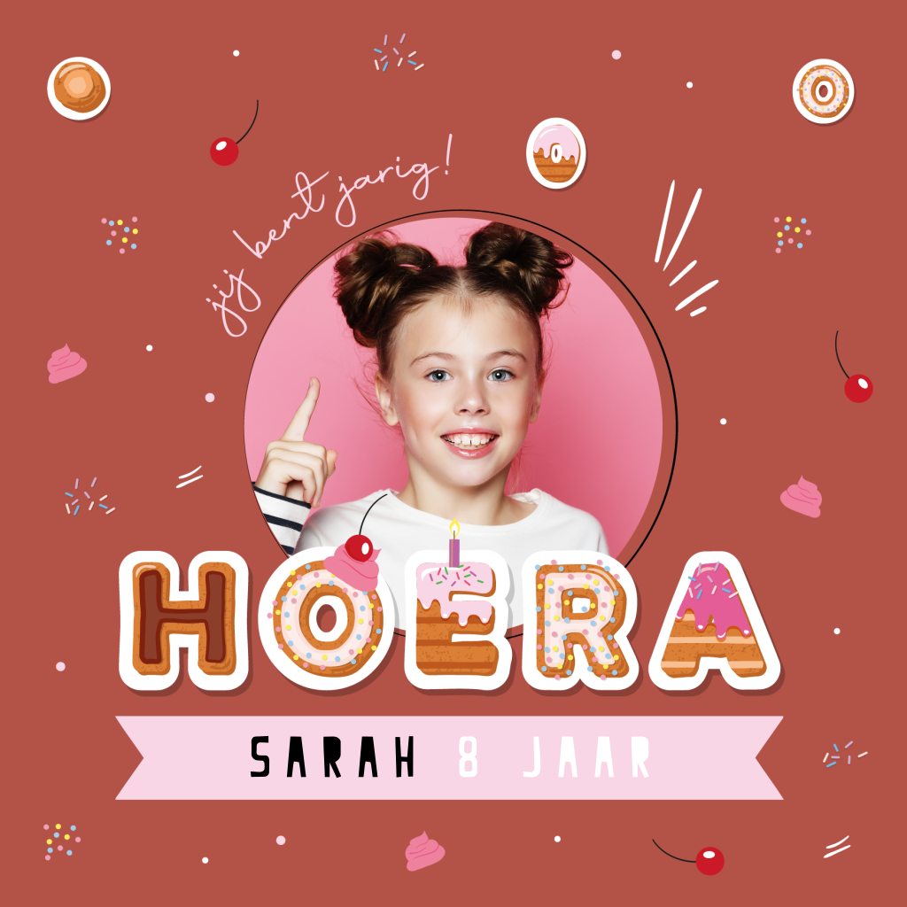 Vrolijke felicitatie kaart voor een meisje met de tekst "hoera" afgebeeld in zoete donut en cupcake illustraties. Vervang de foto voor een leuke foto van de jarige Jet en pas de naam en de leeftijd aan.
