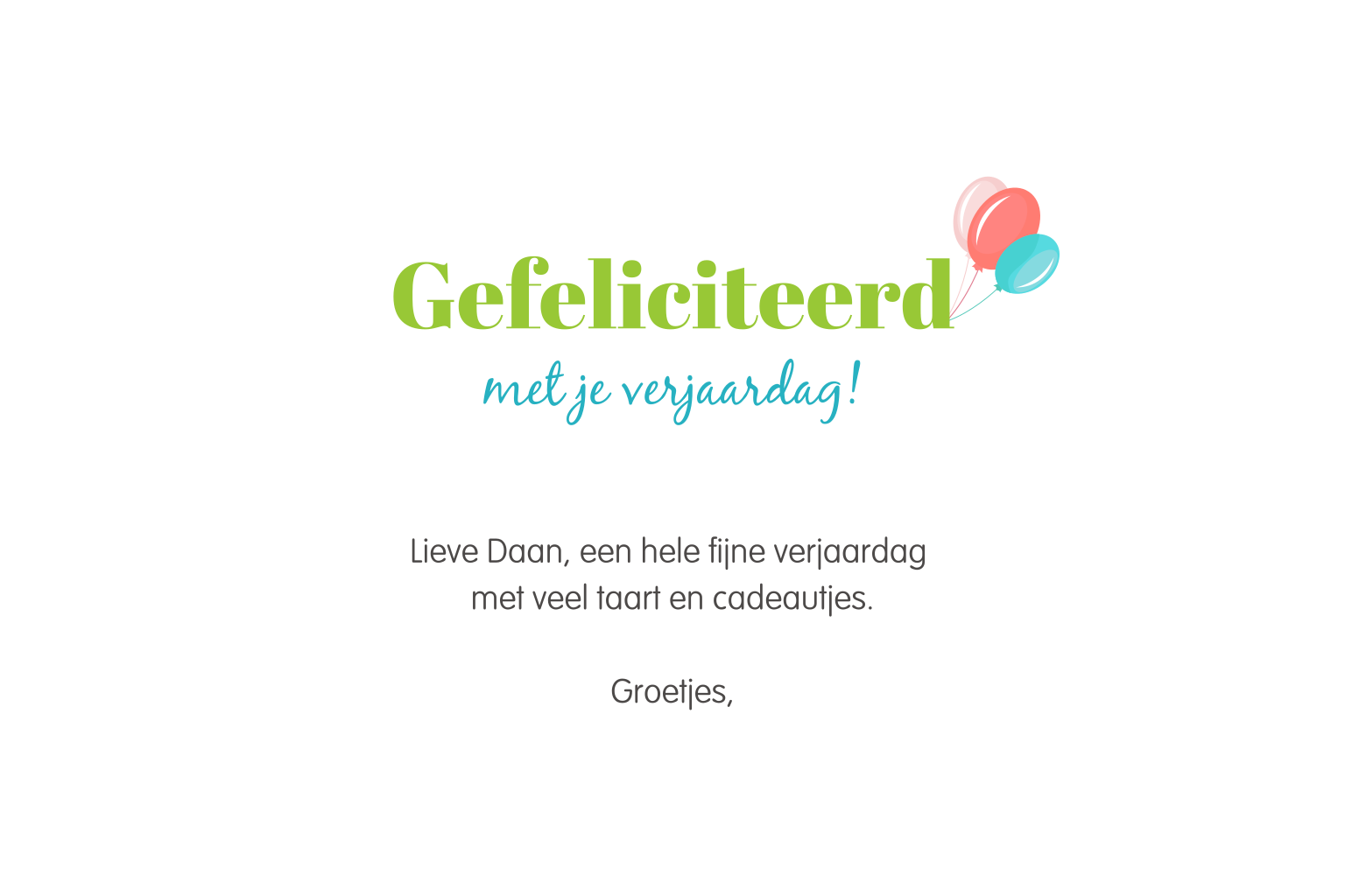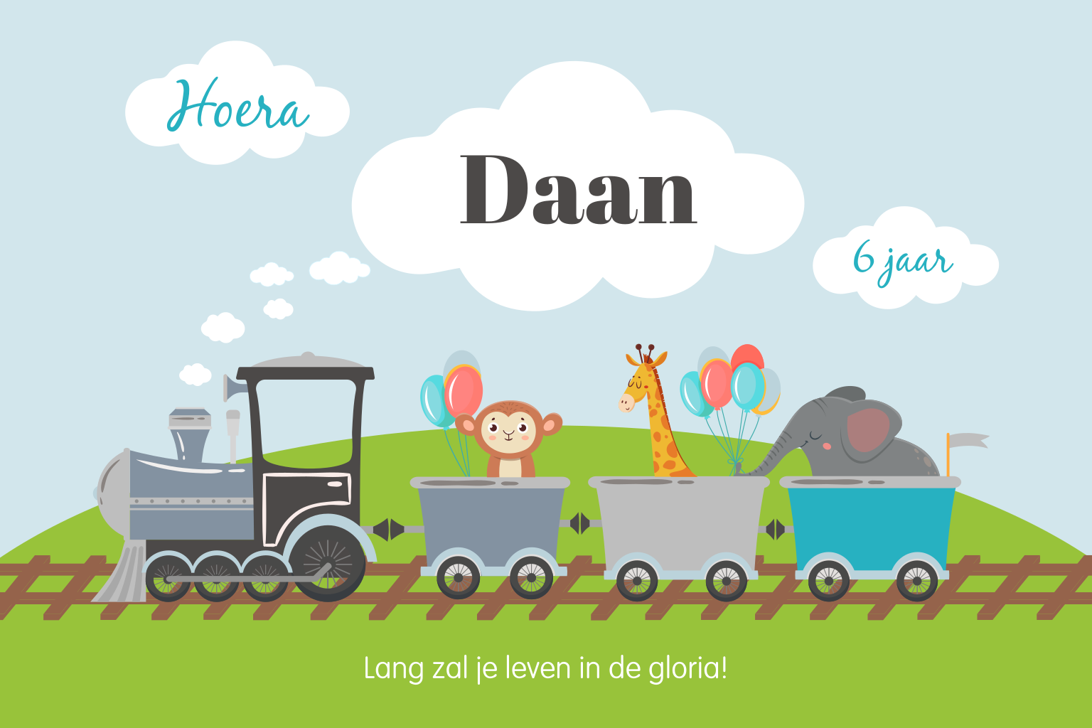 Hoera, er is er één jarig! Stuur als verrassing dit vrolijke dieren verjaardagskaartje naar de jarig job. Op dit kaartje een trein met in elk wagonnetje een ander dier: aap, giraf en olifant. De ballonnen geven helemaal een feestelijke touch aan dit felicitatiekaartje. Naam op voor- en binnenzijde, en leeftijd pas je eenvoudig aan in onze ontwerpmodule.