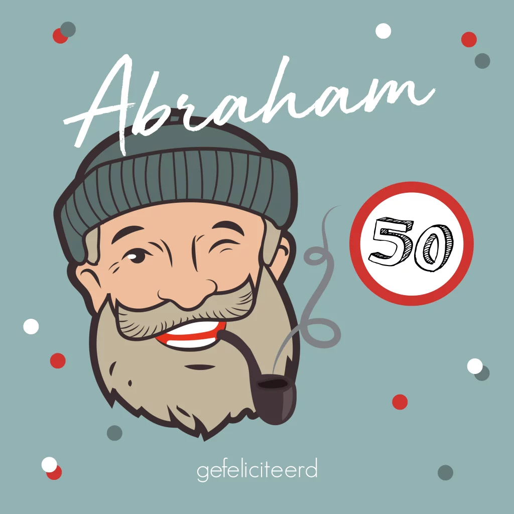 Grappige felicitatie kaart voor een man die Abraham ziet. De leeftijd 50 staat op een verkeersbord en rondom de Abraham illustratie feestelijke confetti.