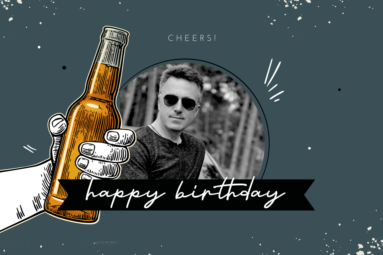 Feliciteer de jarige met deze verjaardagskaart met een proostend biertje in de hand. Vervang de foto voor een persoonlijke foto.