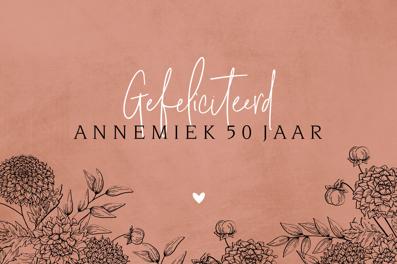Feliciteer de 50-jarige Sarah met deze stijlvolle verjaardagskaart met getekende bloemen. De tekst Gefeliciteerd staat in sierlijke letters met daaronder de naam van de jarige in een strak lettertype.