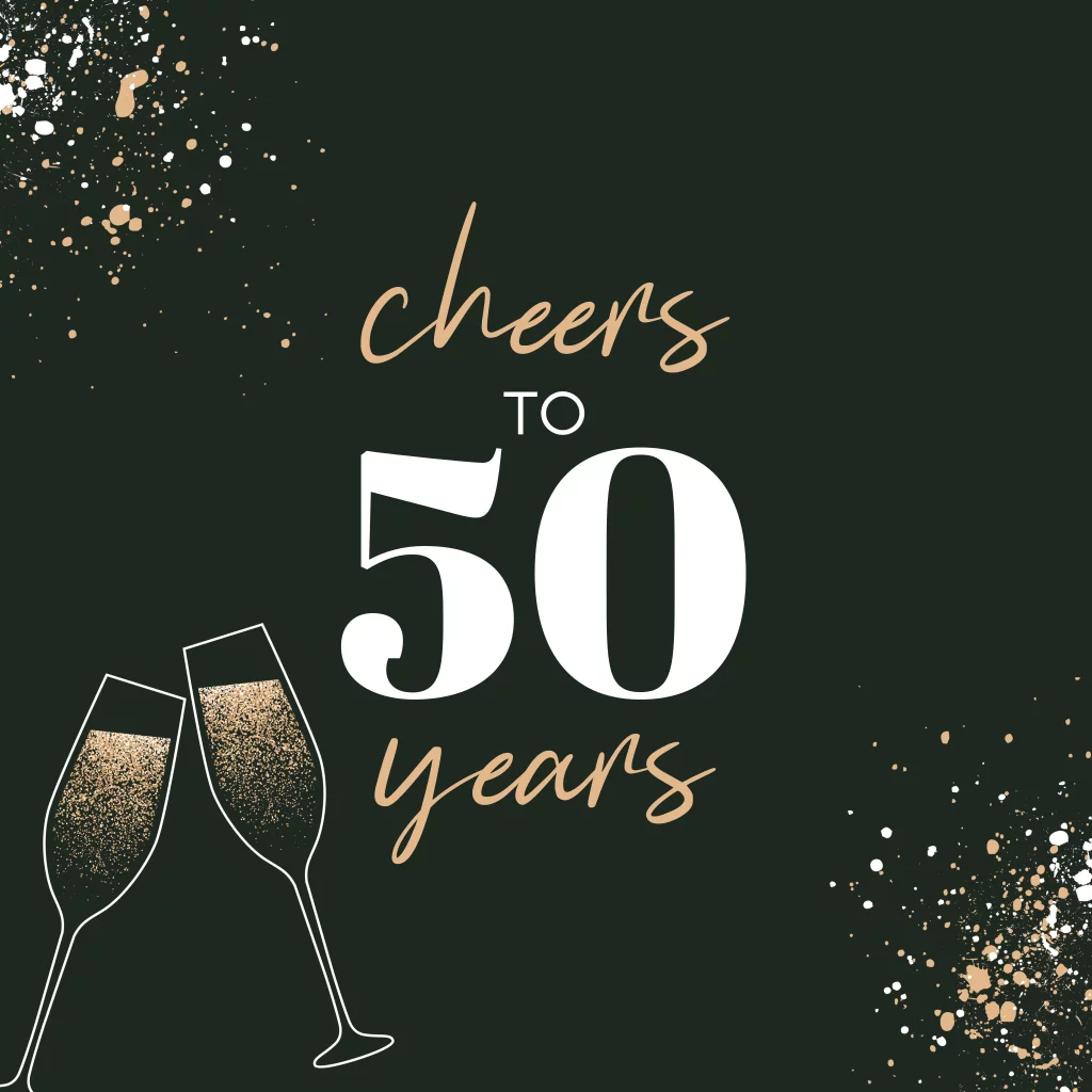 Feestelijke verjaardagskaart voor een man die Abraham ziet of te wel 50 jaar is geworden. Op deze feestelijke wenskaart in donkere tinten staan twee champagneglazen met bubbels. Op deze felicitatie kaart staat de tekst;"Cheers to 50 years". De leeftijd 50 is met een paar klikken aan te passen naar een ander getal.