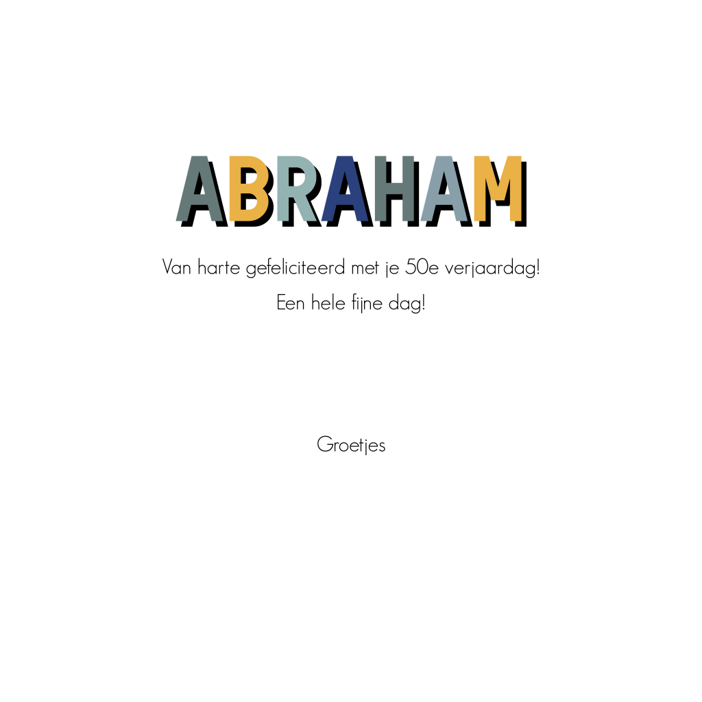 Vrolijk gekleurde felicitatie kaart voor een 50-jarige man. Op deze verjaardagskaart staat de tekst " Abraham" in trendy kleuren.