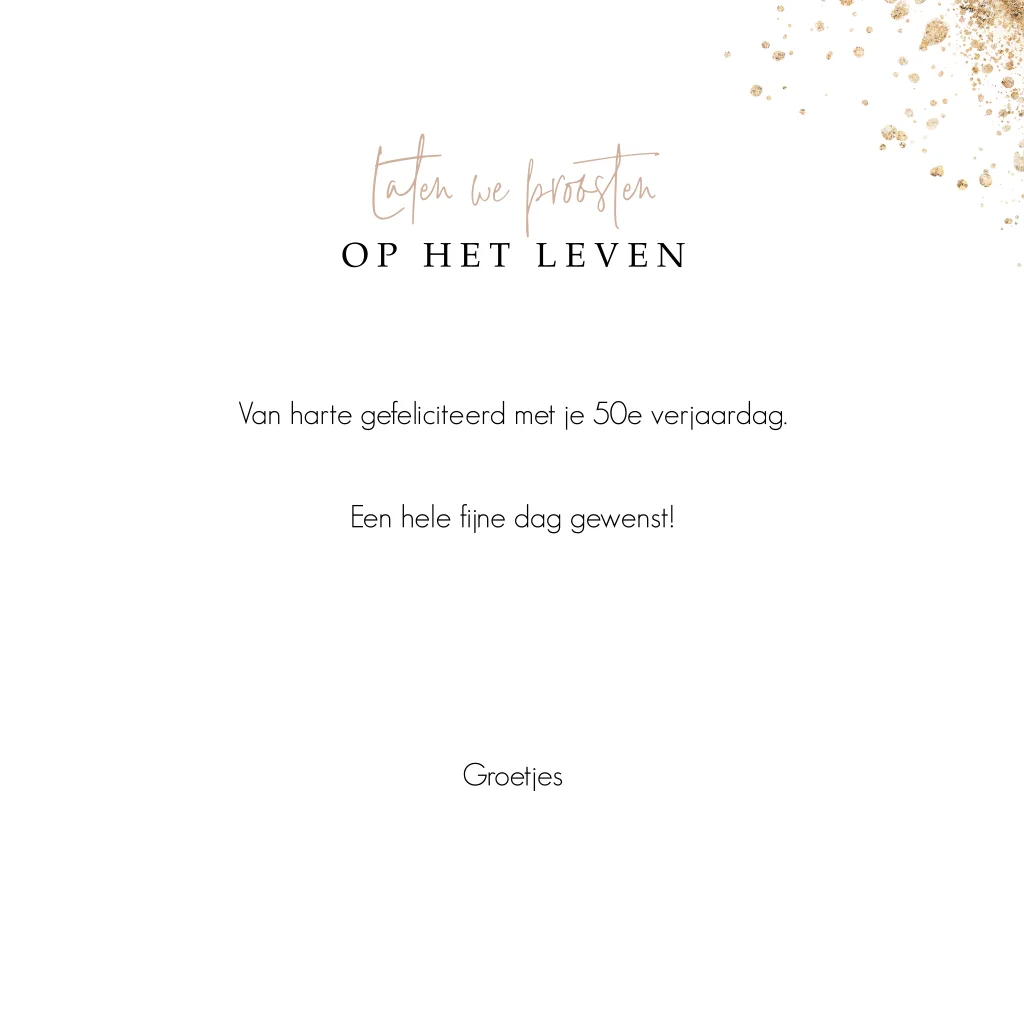 Stijlvolle kaart om een 50-jarige te feliciteren in trendy kleur met aquarel vegen. Op deze verjaardagskaart springt het getal 50 er helemaal uit door de sprankelende gouden kleur.