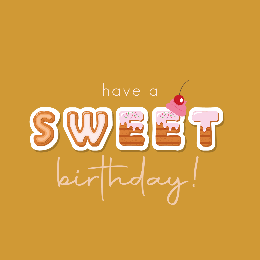 Have a sweet birthday! Zoete felicitatie kaart met het woord "sweet" afgebeeld in zoete cupcake illustraties. Voeg een persoonlijke verjaardagswens toe op de binnenzijde.