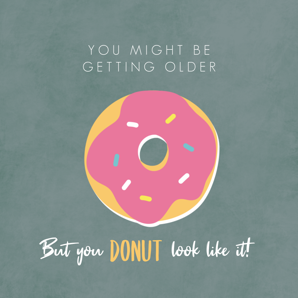 Grappige felicitatie kaart. Op deze verjaardagskaart staat de tekst " You might be getting older But you DONUT look like it!". Centraal op deze kaart een afbeelding van een heerlijke donut.
