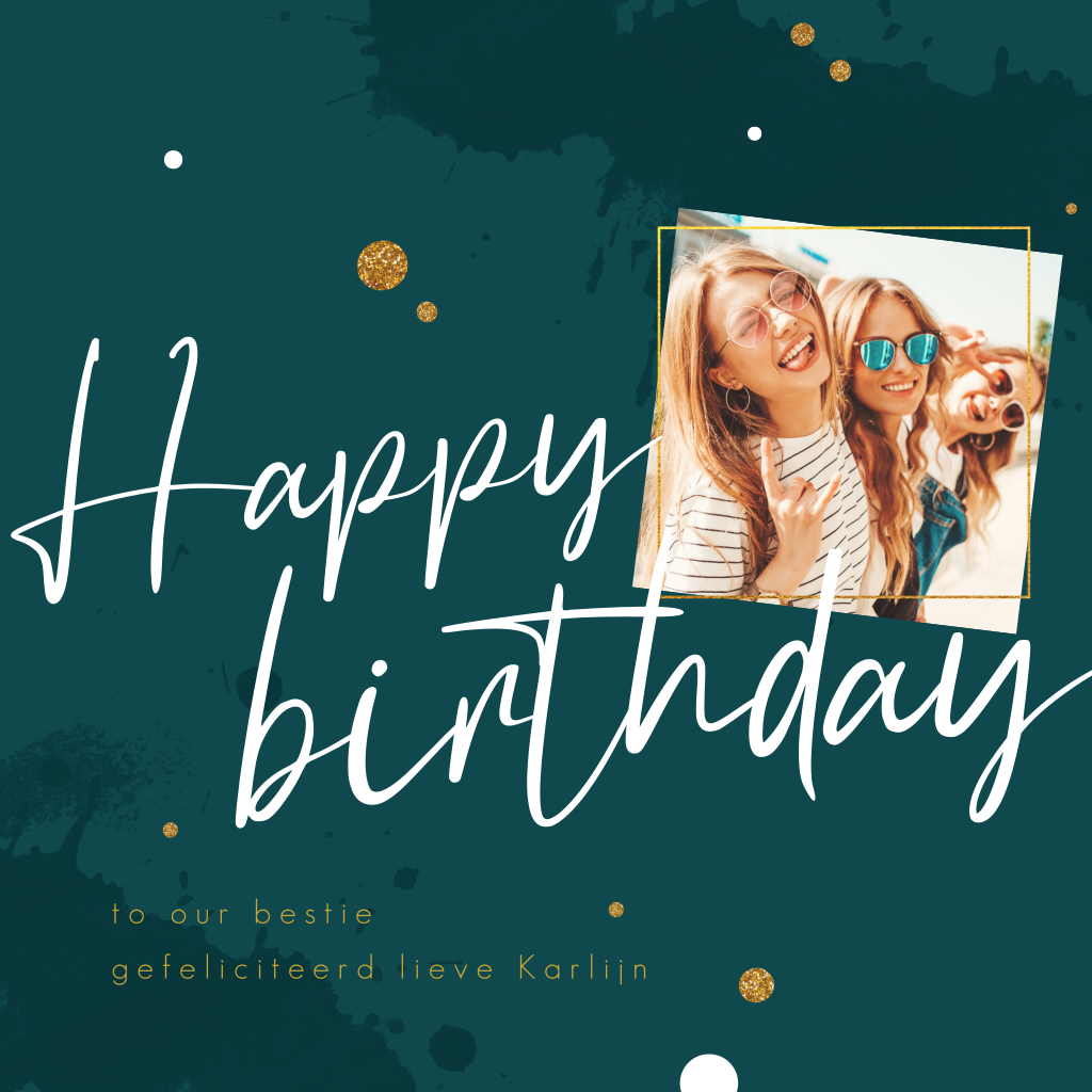 Felicitatiekaart voor een "Happy birthday". Plaats op deze verjaardagskaart een eigen foto, speciaal voor jullie bestie, want zij is jarig! Om de foto een subtiel, speels kader. Confetti maakt het kaartje én het feestje compleet.