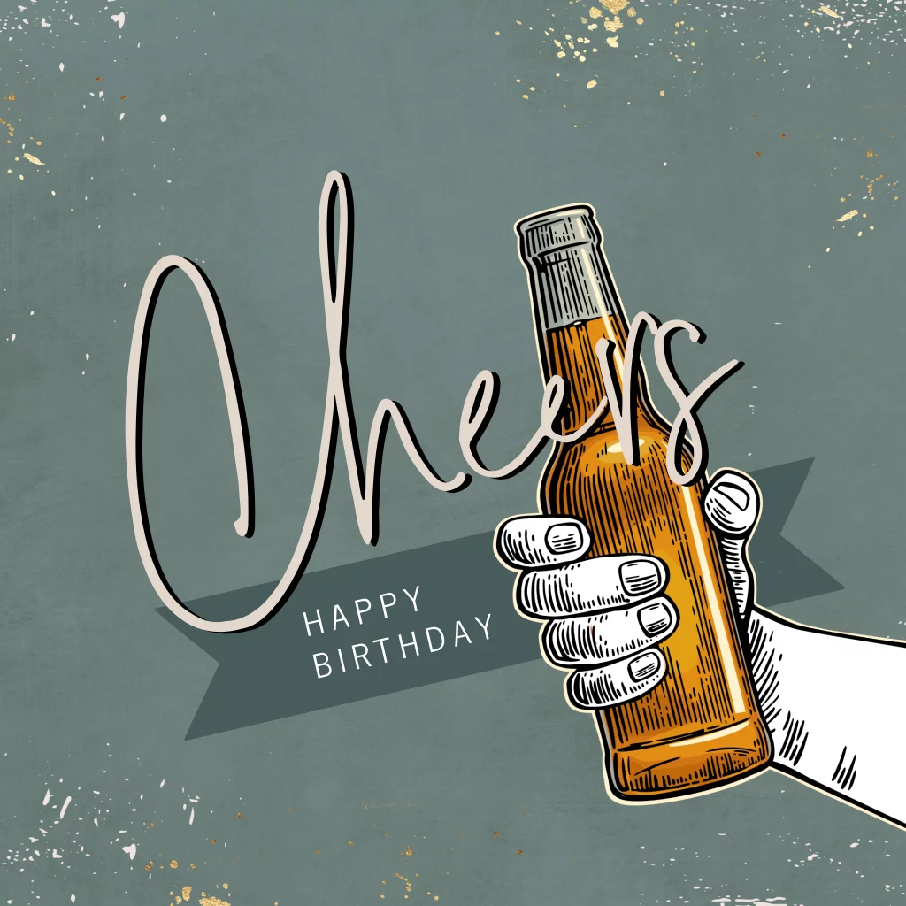 Stoere felicitatie kaart voor een man. Op deze verjaardagskaart staat de tekst "Cheers" en er wordt geproost met een biertje in de hand.