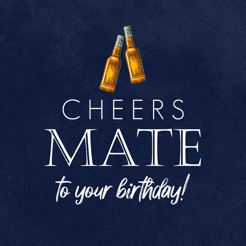 Stoere verjaardagskaart voor een man met folie bedrukking. Op deze felicitatie kaart staan twee bierflesjes en de tekst "Cheers mate to your birthday". De tekst 'mate' wordt gedrukt in goudfolie wat een super mooie uitstraling geeft.