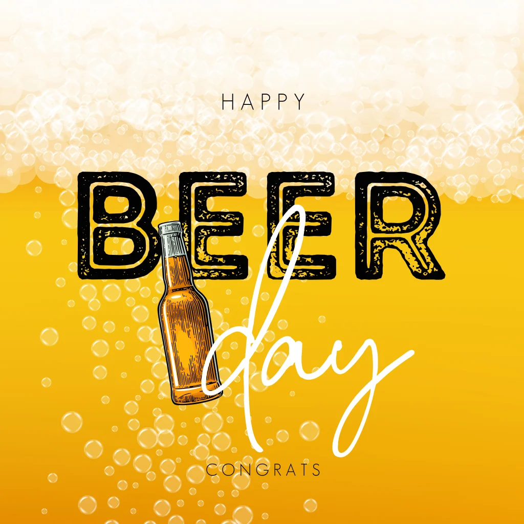 Felicitatie kaart voor een jarige man met de tekst "Happy Beerday" en op de achtergrond sprankelend goudgeel bier.