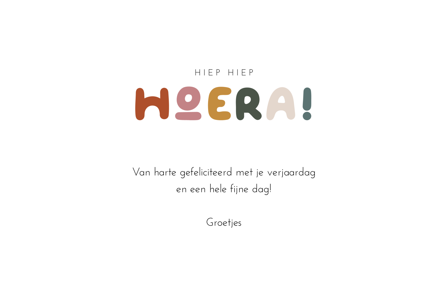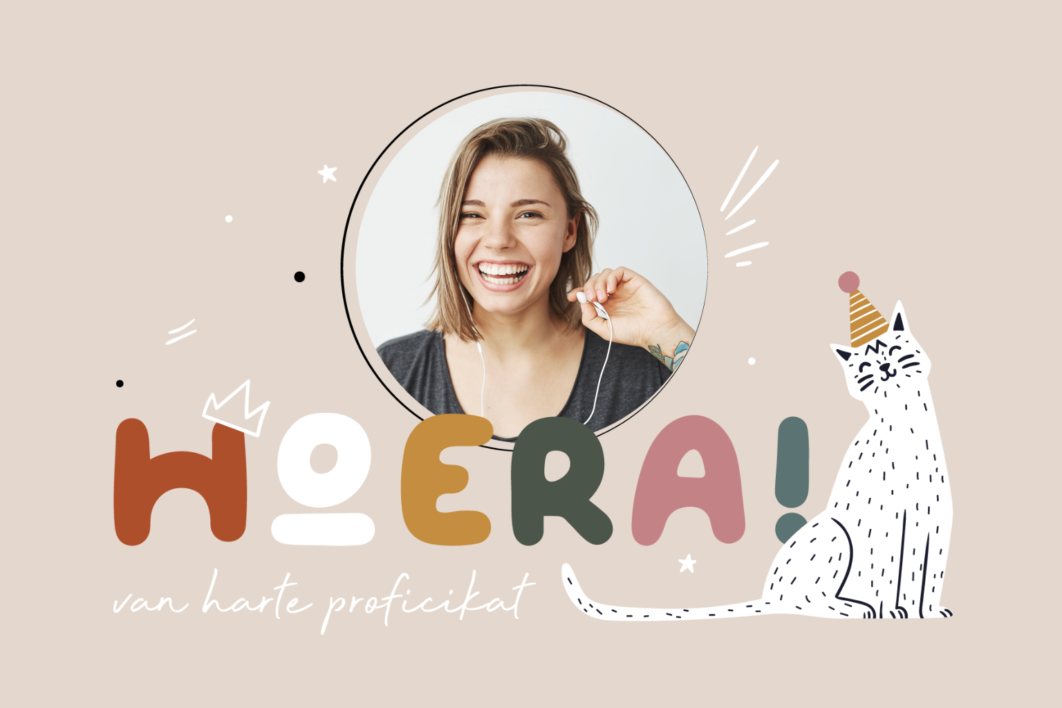 Wens de jarige een fijne verjaardag met deze vrolijke kaart! Op dit felicitatie kaartje een illustratie van een poes met een feestmuts op en de tekst "hoera" in kleurrijke letters. Vervang de foto voor een persoonlijke foto.