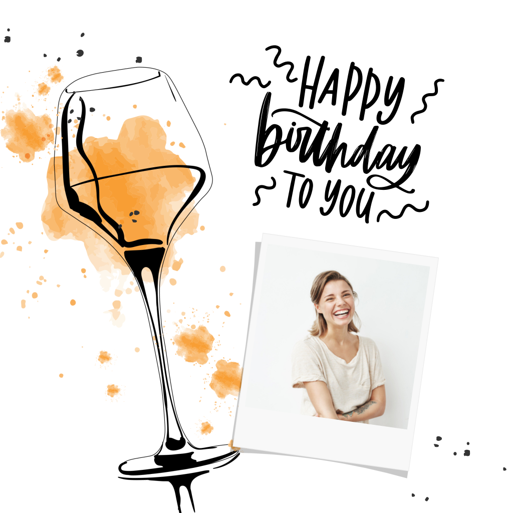 Wens de jarige een Happy Birthday met deze felicitatiekaart met geel aquarel en wijnglas. Vervang de foto voor een eigen foto en voeg een persoonlijke verjaardagswens toe aan de binnenzijde.