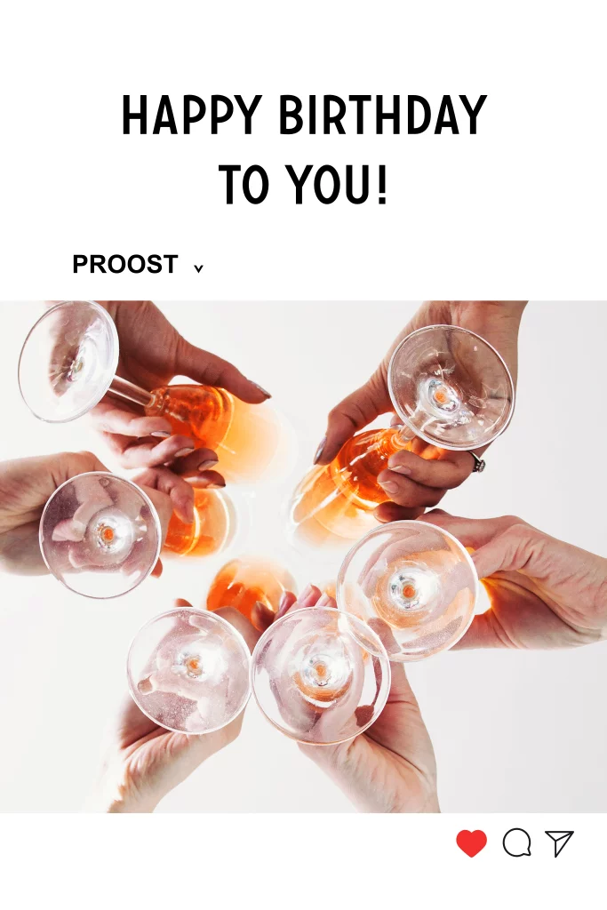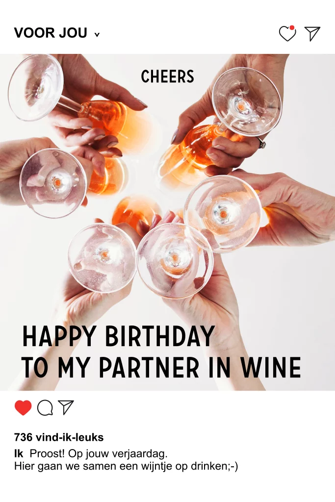 Cheers! Een feestelijke verjaardagskaart als insta post. Wens met deze originele wenskaart je beste vriendin of partner in wine een happy birthday. Op de kaart staat een mooie sfeerfoto met proostende wijnglazen.