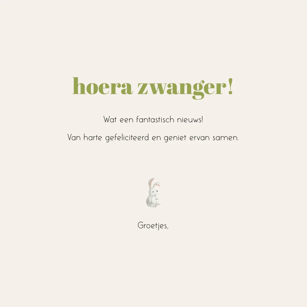 Baby on the way! Hippe felicitatiekaart in natuurlijke kleuren en materialen om de toekomstige ouders mee te verrassen. Op deze kaart een rotan wieg met een konijnenknuffel erin, een kleerhanger met babypakje, rieten manden en een jute kleed met een zebra erop.