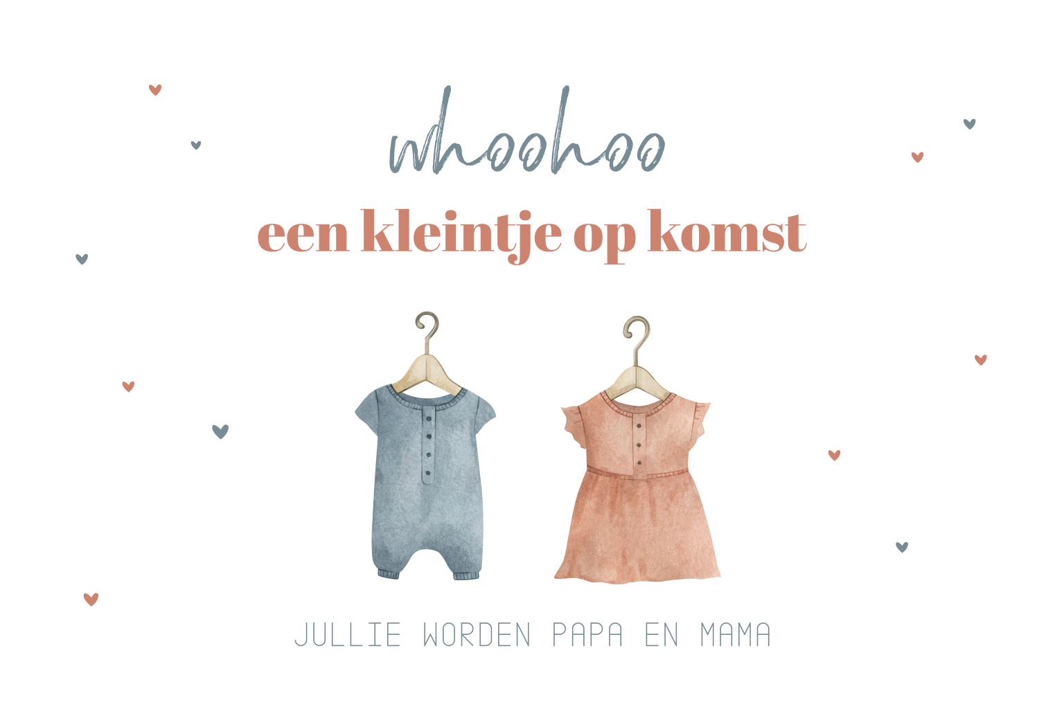 Iemand zwanger? Stuur dan dit lieve felicitatiekaartje met twee schattige babypakjes: voor een jongen en een meisje.