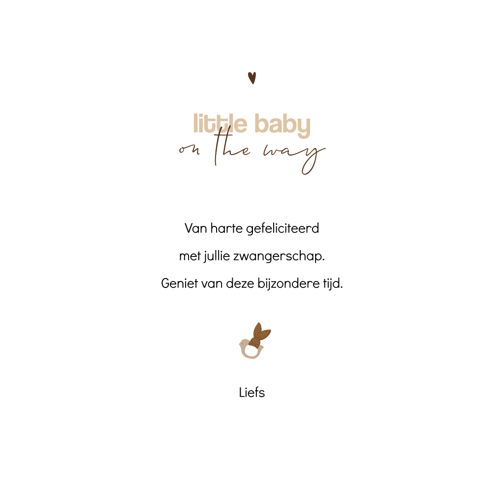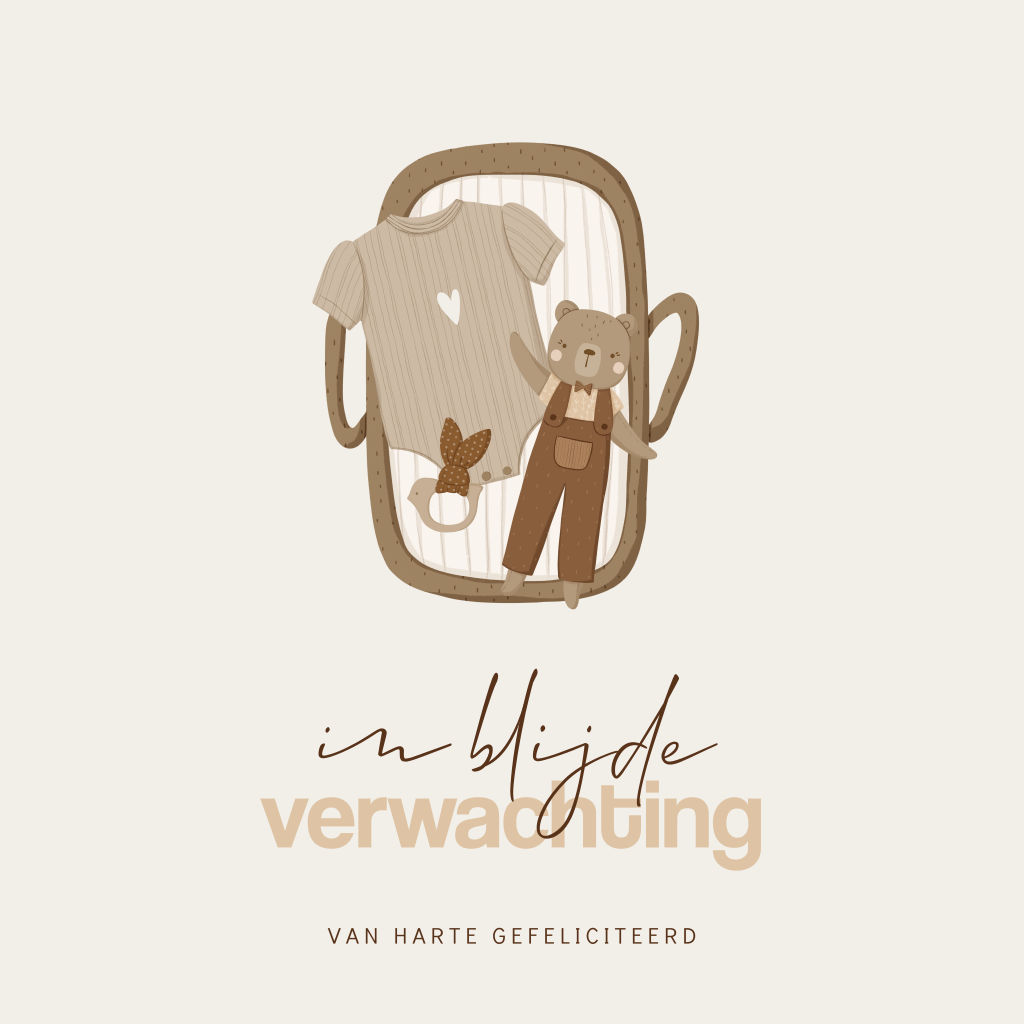 Neutrale felicitatiekaart voor iemand die in blijde verwachting is. De kaart heeft een rustige beige achtergrond met tekst in verschillende strakke en sierlijke lettertypes. Het verschoonmandje met een rompertje, knuffeltje van een beertje en een bijtring maakt de kaart helemaal af. Deze kaart is perfect voor diegenen die op zoek zijn naar iets anders dan een saaie, traditionele felicitatiekaart. Het unieke ontwerp maakt deze kaart een echte eyecatcher.