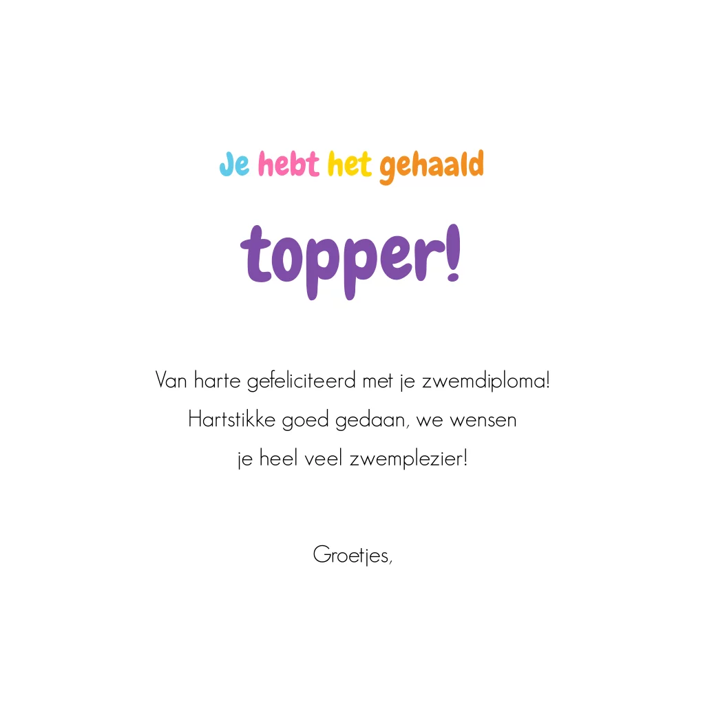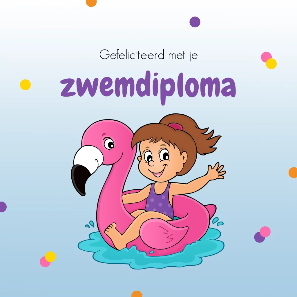 Afzwemmen is een mijlpaal voor kinderen. Feliciteer je dochter, nichtje of buurmeisje met haar zwemdiploma met deze vrolijke felicitatiekaart. Op deze wenskaart een meisje in het water op een opblaasbare flamingo. Op de achtergrond kleurrijke stippen.
