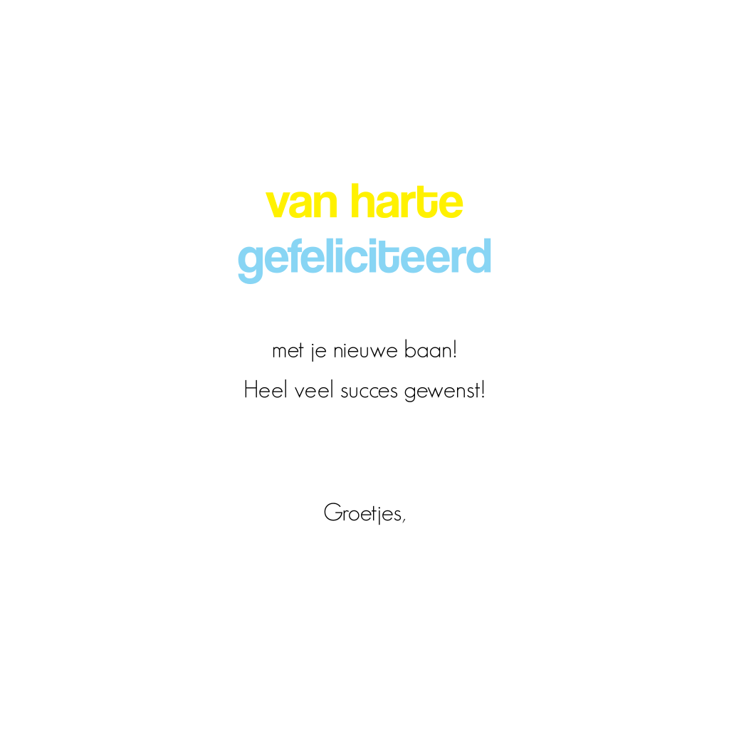 Felicitatiekaart met klavertje vier om iemand succes te wensen met een nieuwe baan of nieuwe functie. Deze typografische wenskaart heeft een betonlook achtergrond wat de kaart een stoere uitstraling geeft. De verschillende kleuren lettertypes springen er hierdoor extra uit.