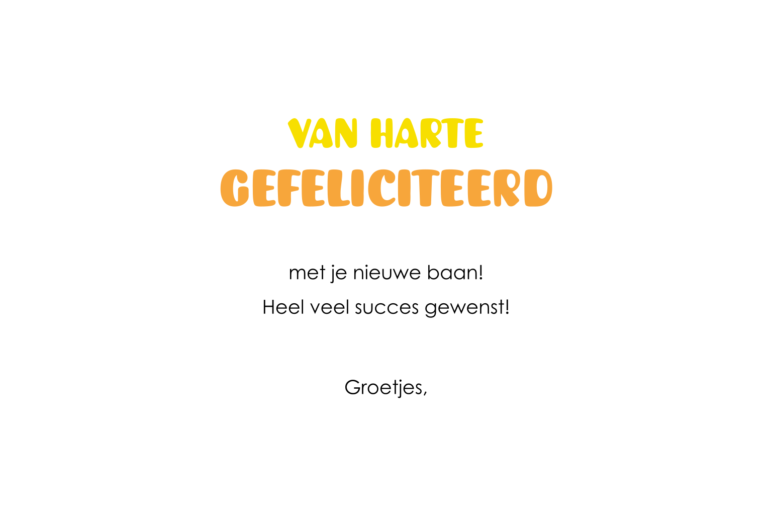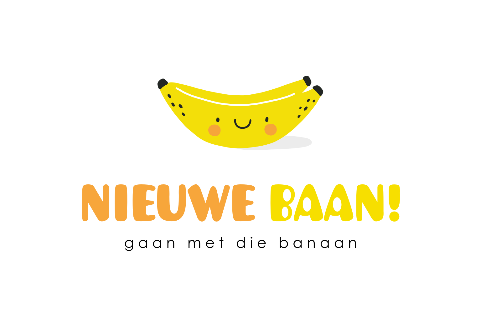 Vrolijke wenskaart om iemand te feliciteren met een nieuwe baan. Op deze kaart een banaan met de tekst ´gaan met die banaan´.