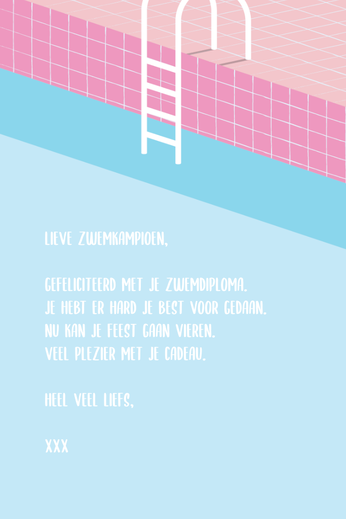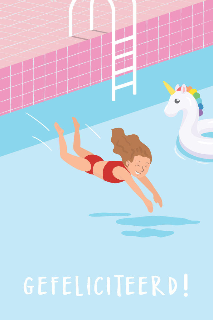 Dit is een unieke wenskaart voor een meisje dat net haar zwemdiploma heeft behaald! De kaart heeft een mooie afbeelding van een meisje dat in het water duikt. In het zwembad drijft een unicorn zwemband.