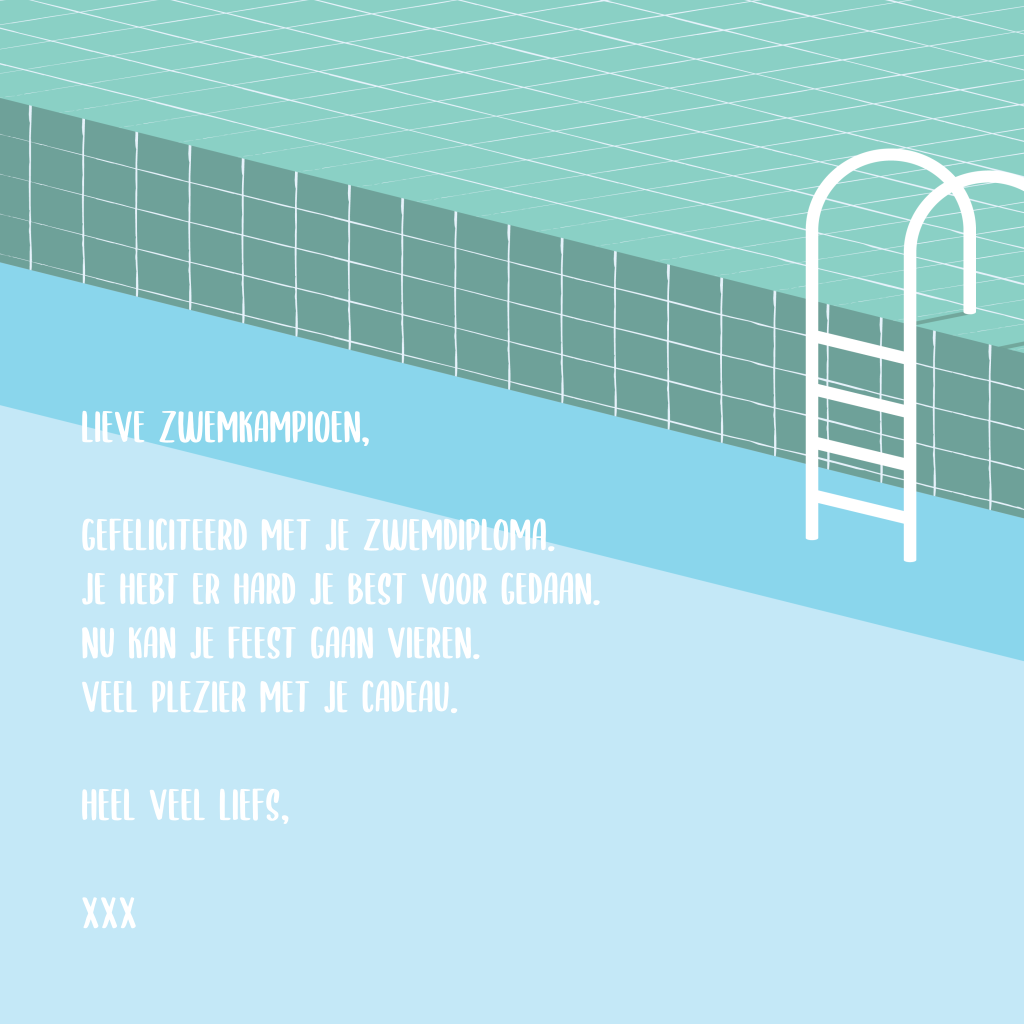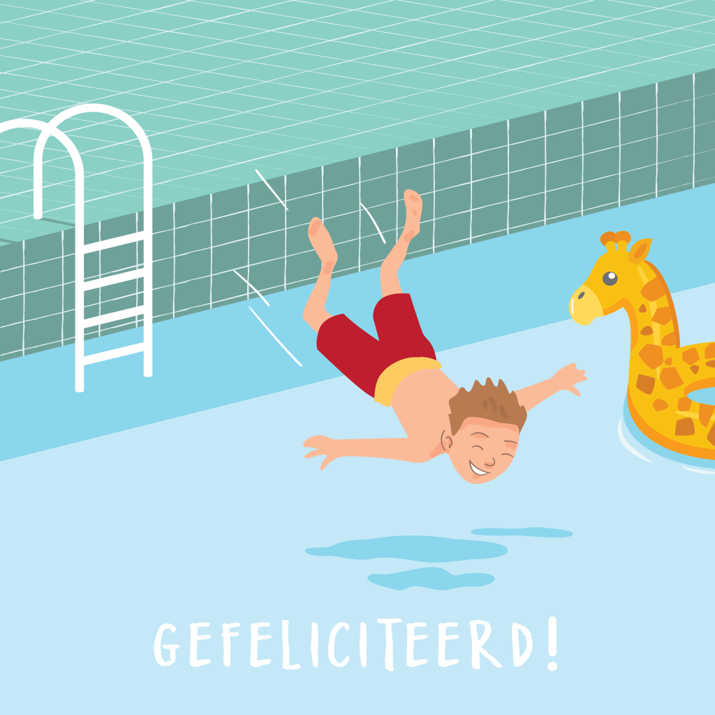 Op deze wenskaart staat een vrolijke jongen die net zijn zwemdiploma heeft behaald. Het is een leuke felicitatiekaart voor iemand die net is geslaagd voor zijn ABC diploma of voor iemand die van zwemmen houdt.