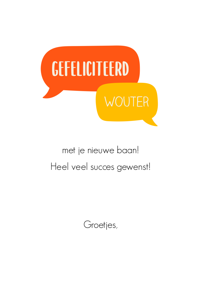 Wenskaart om iemand succes te wensen met een nieuwe baan. Op deze vrolijke felicitatiekaart staan tekstballonnen in verschillende kleuren, een laptop en potlood. Extra leuk aan deze kaart is dat je de teksten kunt aanpassen.