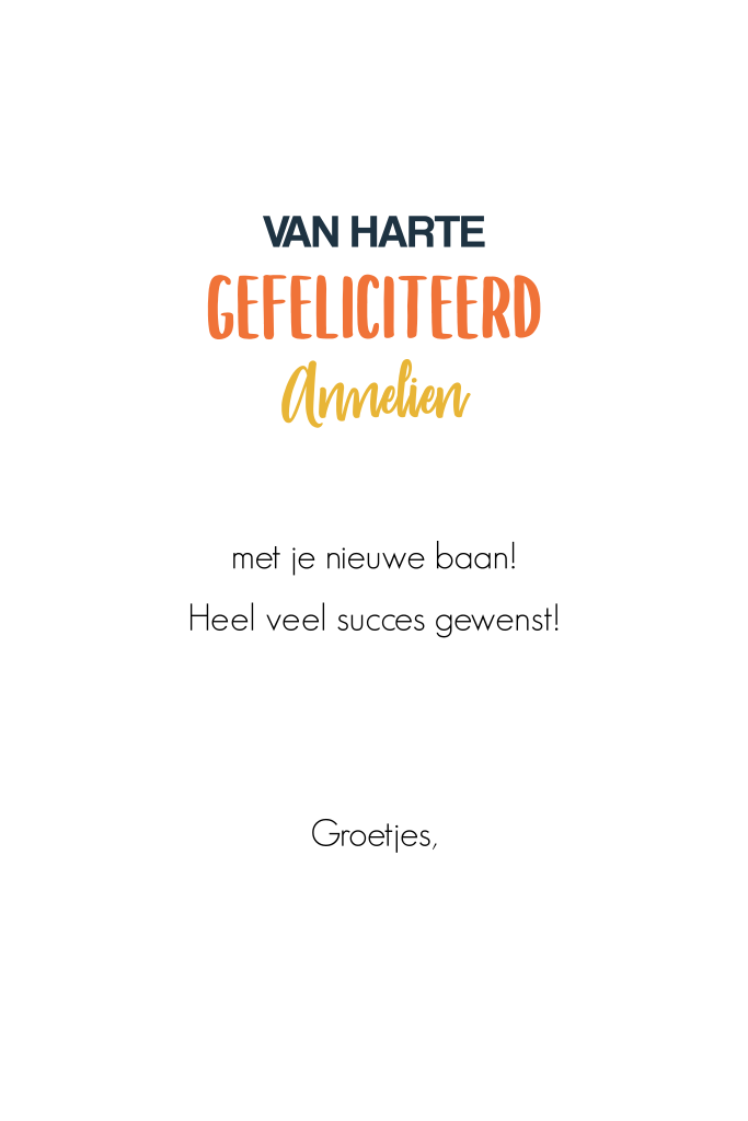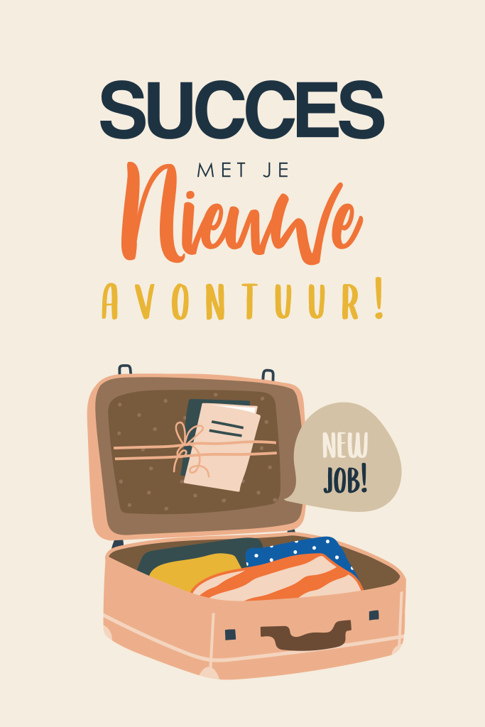 Hippe wenskaart om iemand succes te wensen met een nieuw avontuur, namelijk een nieuwe baan! Op deze felicitatiekaart staan de teksten in verschillende lettertypes met daaronder een afbeelding van een koffer en een tekstballon met daarin de tekst ´new job´.