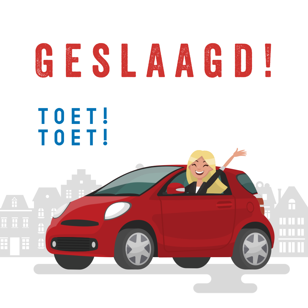 Dit is een unieke wenskaart voor iemand die net haar rijbewijs heeft gehaald! Op deze kaart een huizenrij met een vrolijke vrouw in een rode auto.