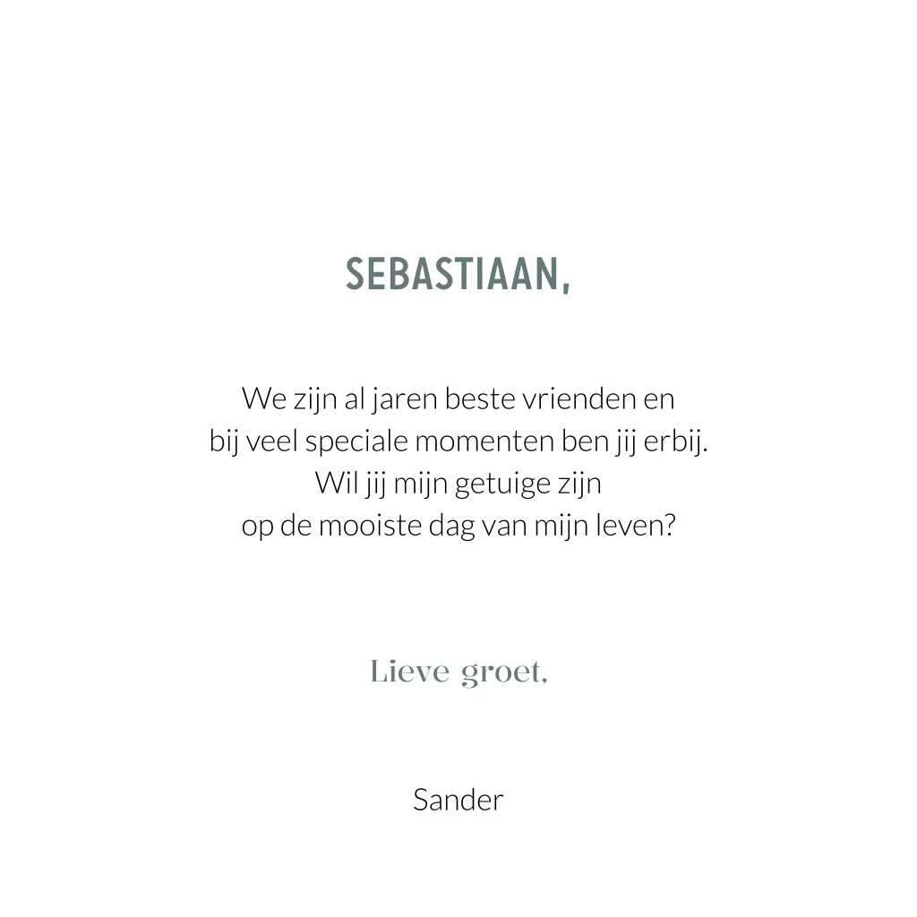 It´s time to suit up! Vraag op een unieke manier met deze prachtige wenskaart je getuige voor je bruiloft. De goudkleurige foliedruk geeft deze kaart een extra luxe uitstraling. Het rustige design met het glanzende foliedruk maakt deze kaart perfect voor deze bijzondere gelegenheid. Maak van het vragen van je getuige een onvergetelijk moment met deze kaart!