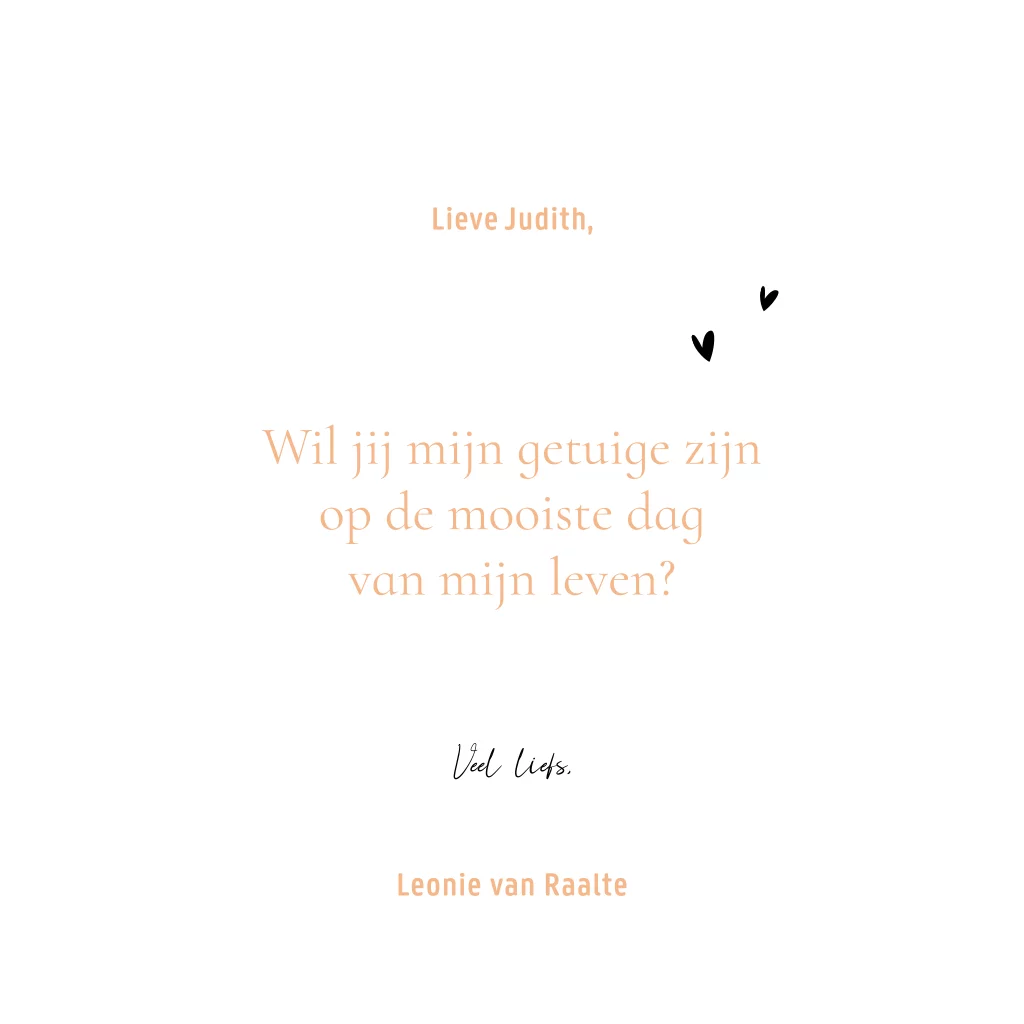 Deze prachtige wenskaart is een stijlvolle manier om je getuige te vragen. Het toffe ontwerp met strepen, trouwring en hartjes maakt deze kaart een mooie keuze om jouw getuige op een bijzondere manier te vragen. Pas deze wenskaart naar eigen wens aan in de online editor en verras de ontvanger met een speciale boodschap!