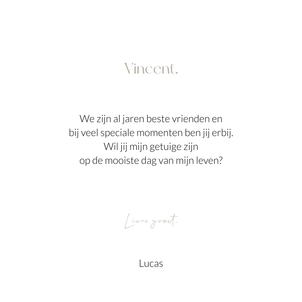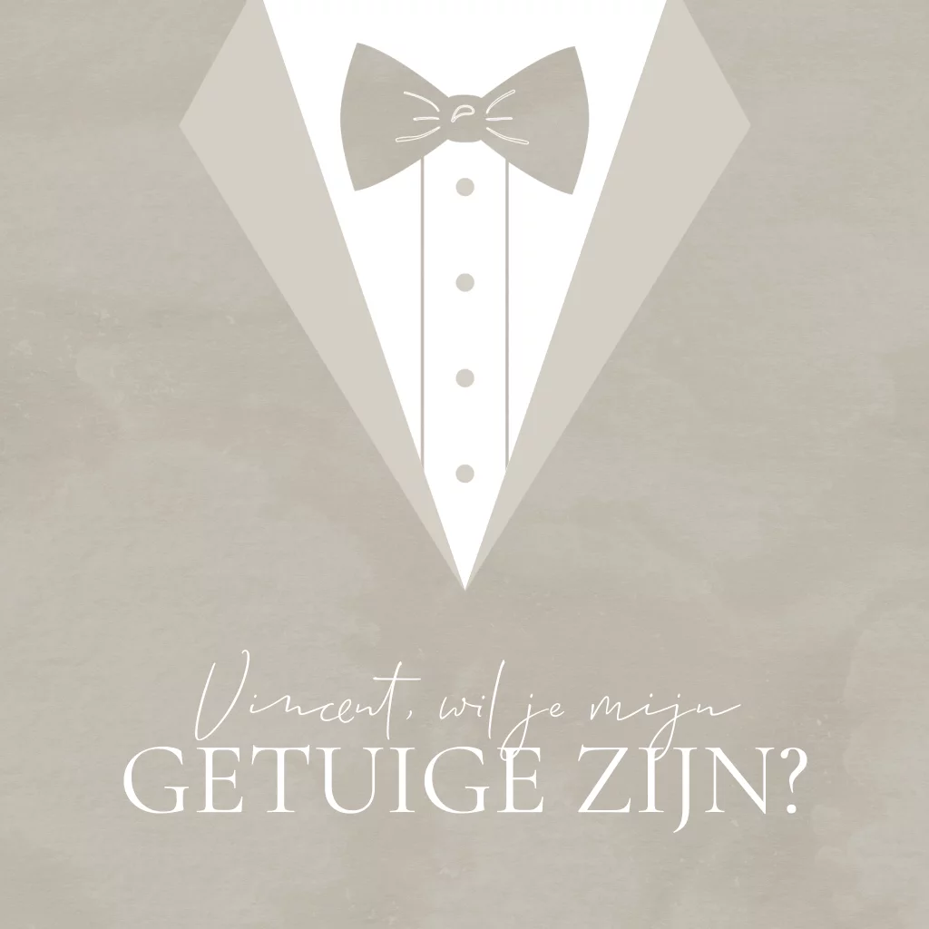 Op zoek naar een originele manier om je getuige te vragen? Met deze unieke kaart maak je op een leuke manier jouw speciale vraag aan je getuige bekend. Op deze kaart zie je in beige/bruine kleurtinten een pak afgebeeld met de vraag ´Wil je mijn getuige zijn?'. Pas deze kaart naar eigen wens aan in de online editor en laat de ontvanger van deze kaart versteld staan.
