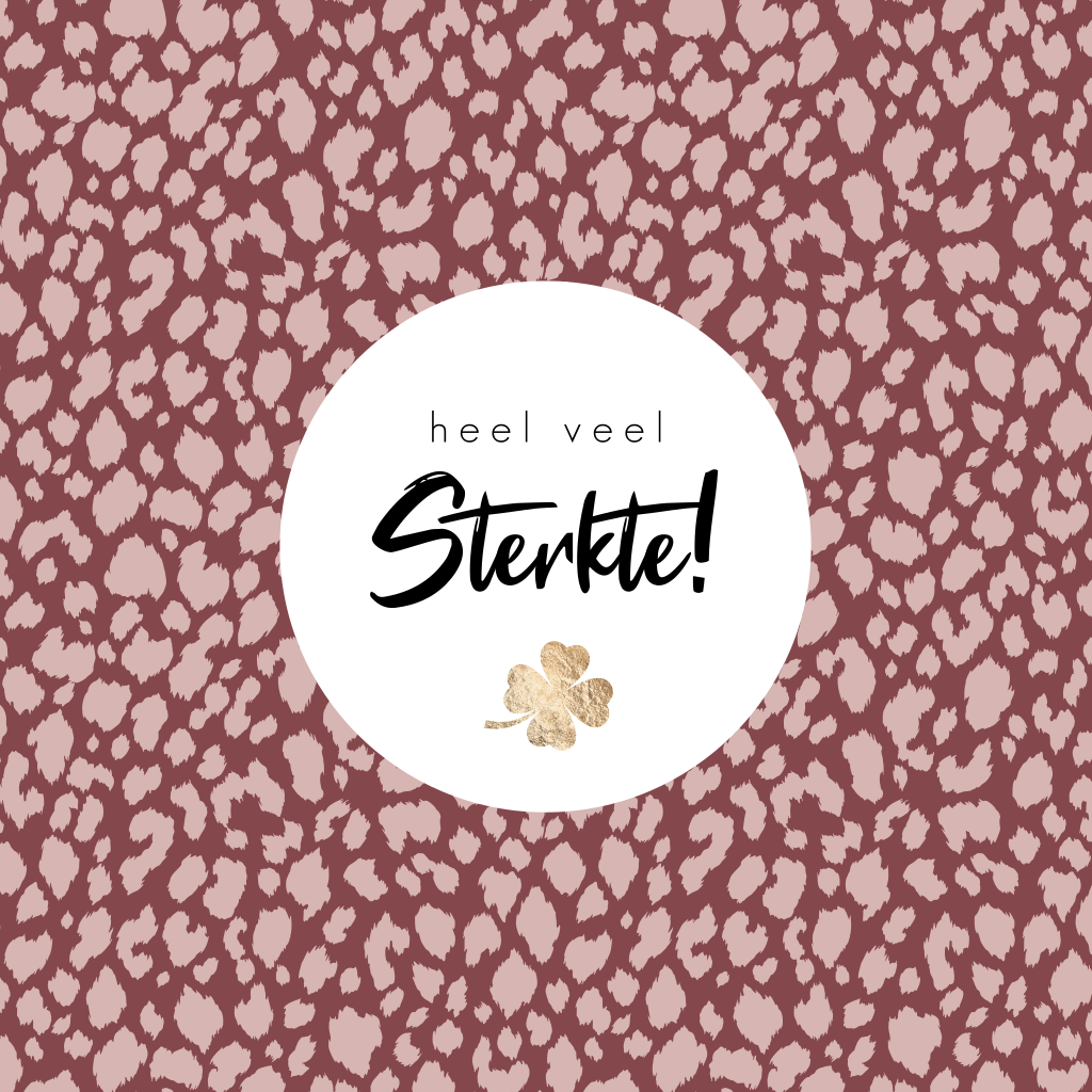 Sterkte kaart voor iemand die wel een knuffel kan gebruiken. Op deze kaart de tekst "Heel veel sterkte", een klavertje vier voor geluk en een dierenprint op de achtergrond.