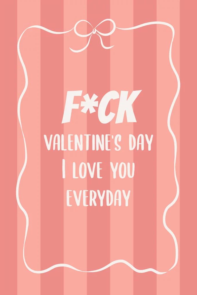 Stuur je grote liefde deze valentijnskaart met de tekst F*ck valentine's day, I love you everyday. Deze wenskaart heeft een gestreepte achtergrond en een speels kader met een geïllustreerd strikje. Pas kleuren en teksten naar eigen wens aan in onze online editor.