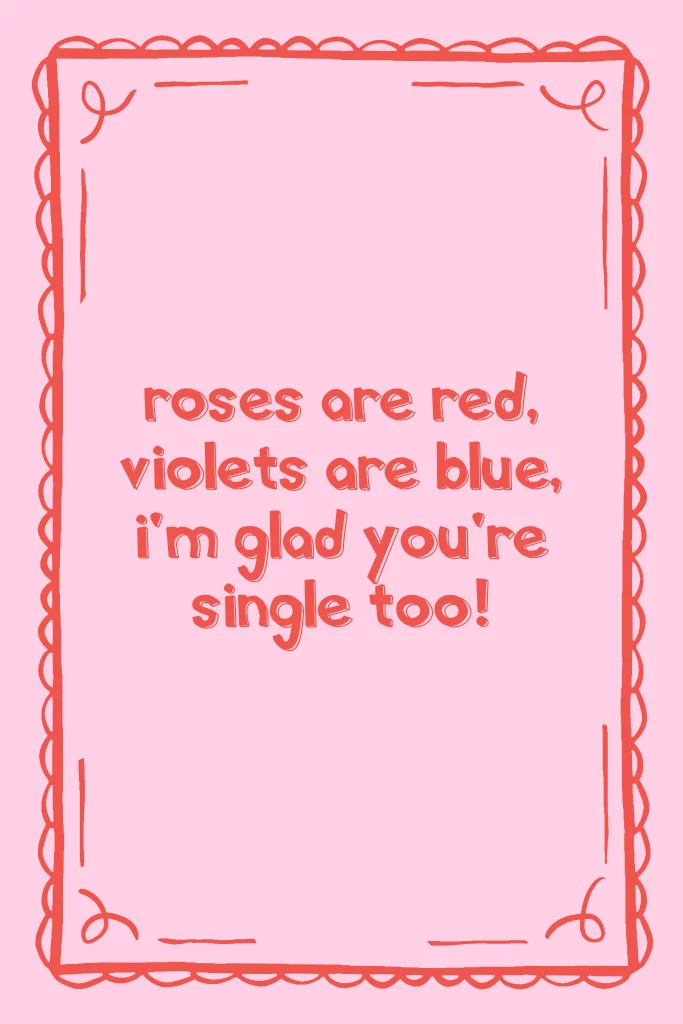 Een superleuke valentijnskaart met de tekst 'Roses are red, violets are blue, I'm glad you're single too!'. Verstuur deze wenskaart naar je Valentijn en laat weten hoe bijzonder deze persoon voor je is.