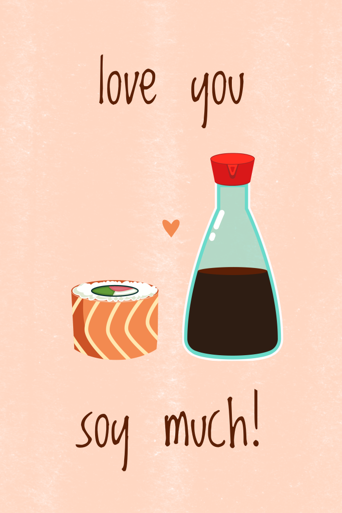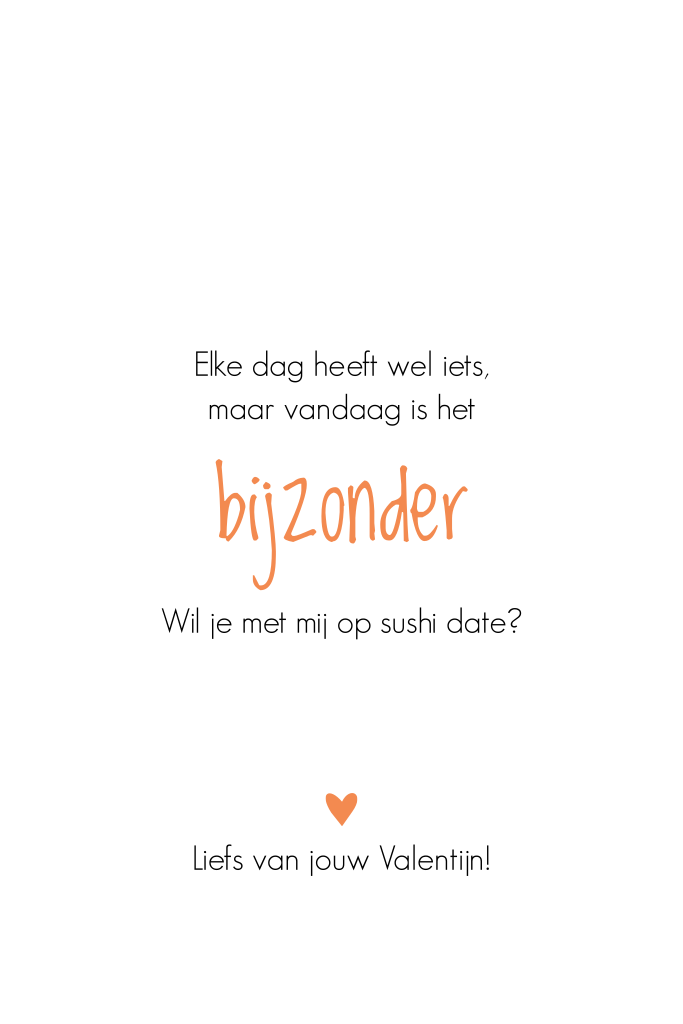 Is jouw (geheime) grote liefde gek van sushi? Nodig hem of haar dan uit voor een sushi date met deze grappige valentijnskaart met de tekst 'love you soy much!'. Deze kaart is uniek en staat garant voor een glimlach op het gezicht van je geliefde. Ook leuk om naar single vriendinnen te sturen en samen Valentijn te vieren.