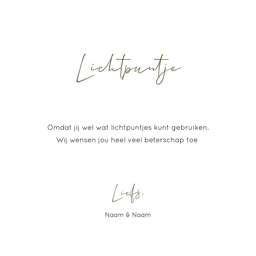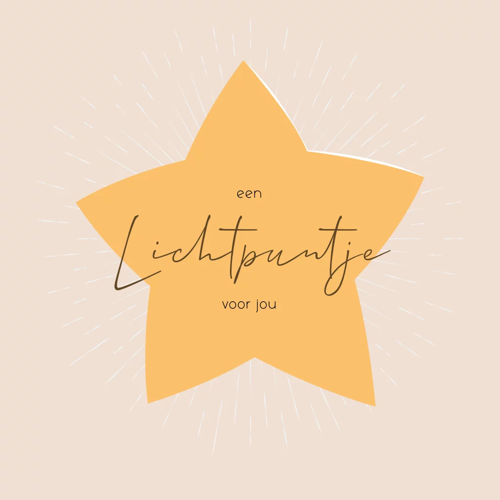 Laat weten dat je aan iemand denkt en hem of haar beterschap wenst met deze mooie beterschapskaart. Je ziet een ster met de tekst 'een lichtpuntje voor jou'. Stuur dit prachtige lichtpuntje naar iemand die wel een beetje extra steun kan gebruiken.