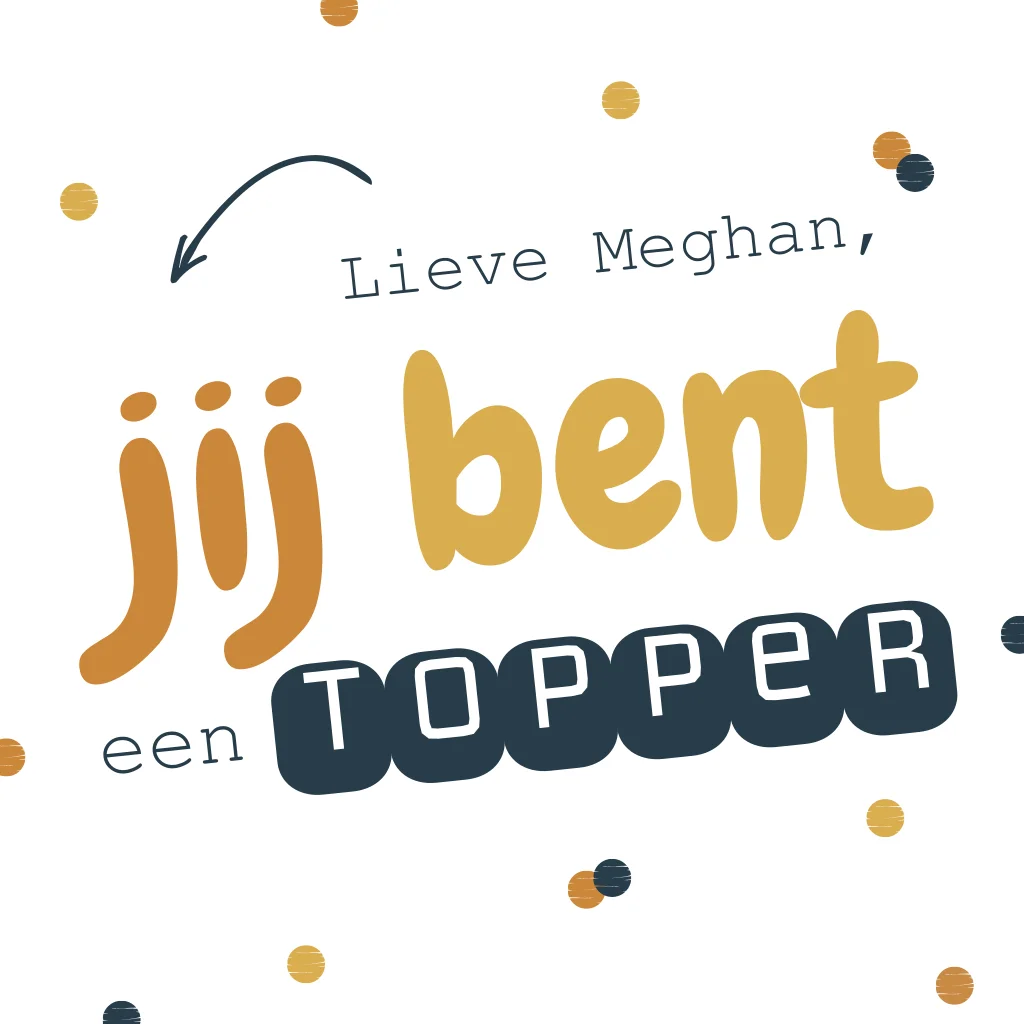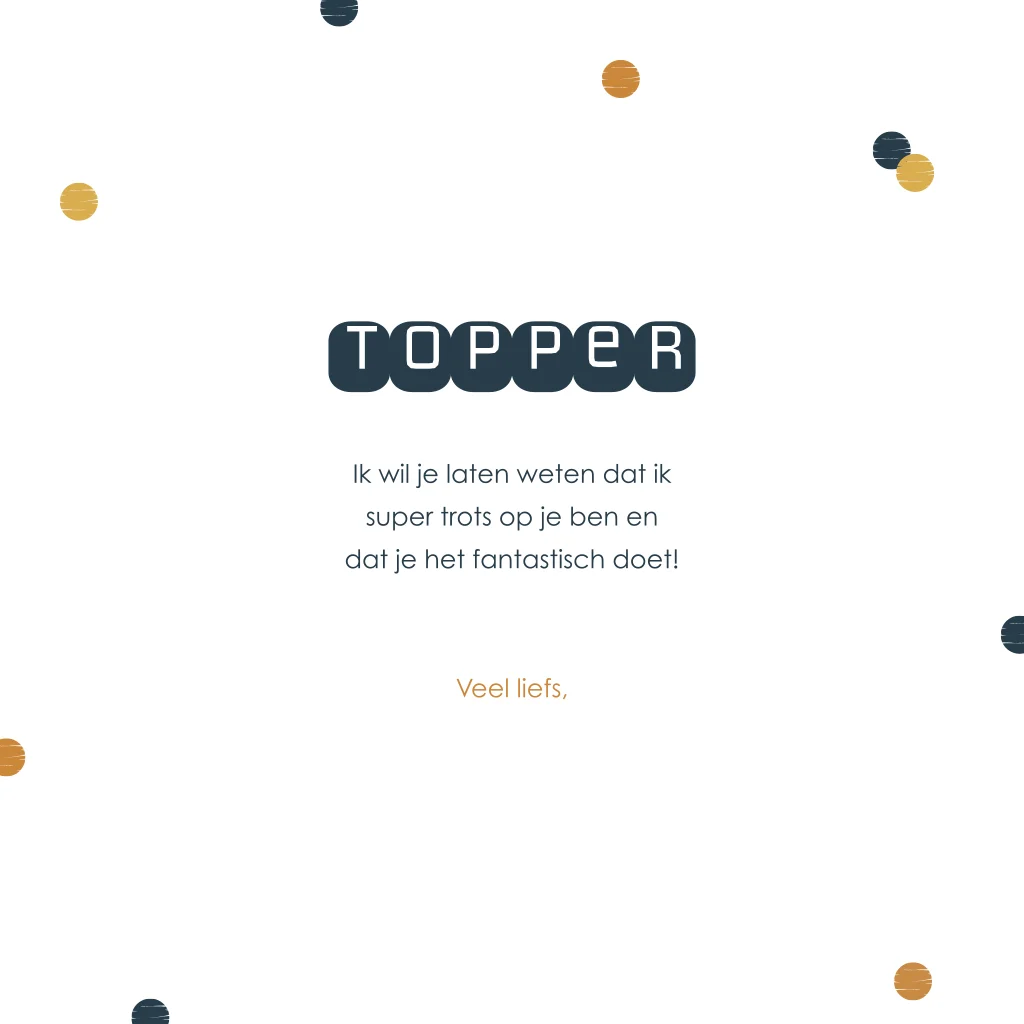 Wil jij iemand laten weten dat je trots op diegene bent, hij of zij een topper is of gewoon zomaar een lief compliment geven? Zeg het met deze mooie wenskaart in trendy kleuren met confetti stippen. Extra persoonlijk met de naam van de ontvanger op de voorzijde. De tekst kun je aanpassen in de ontwerpmodule.
