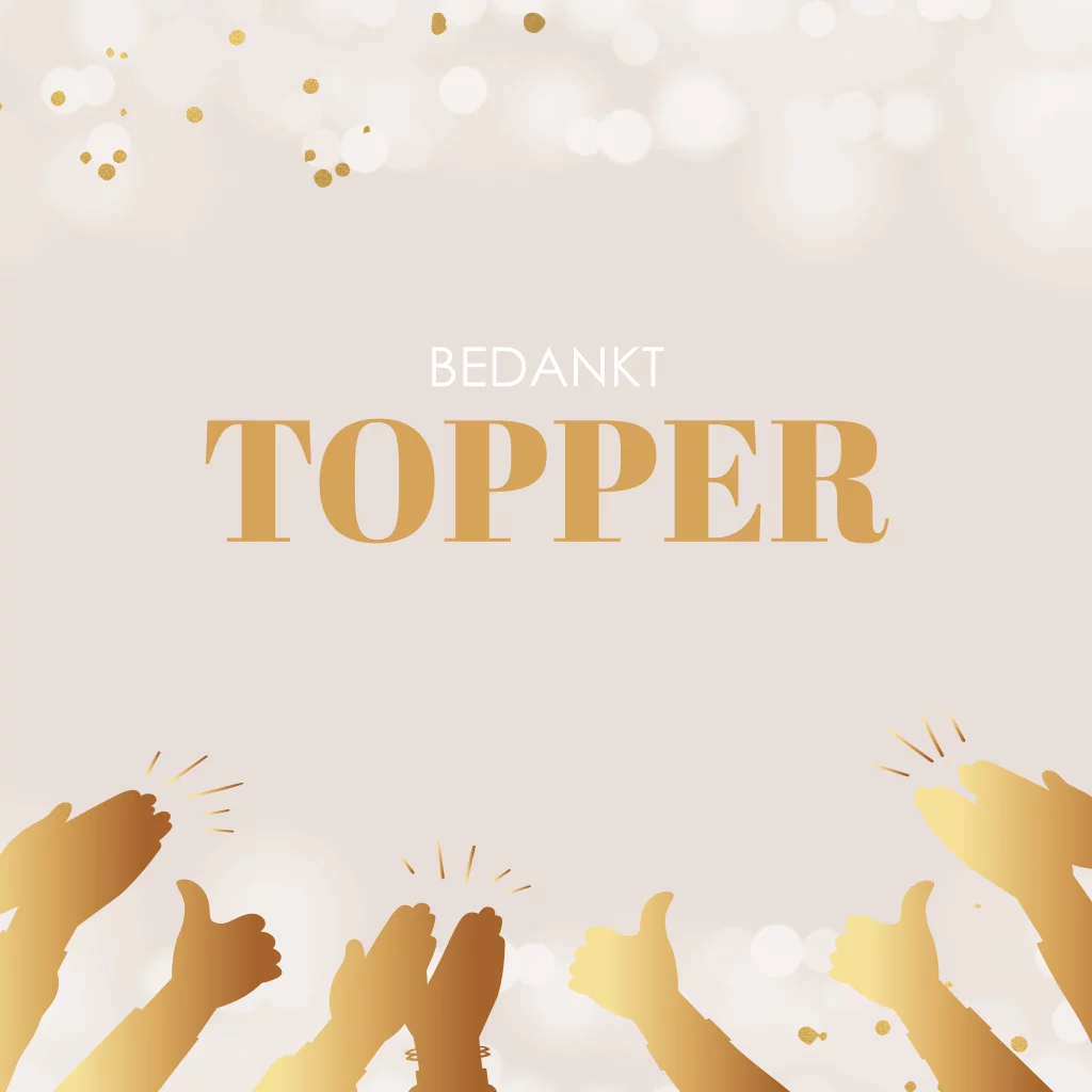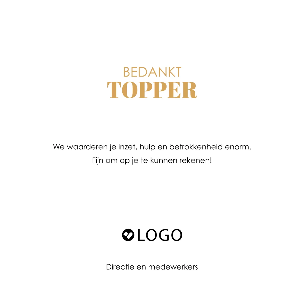 Zakelijke wenskaart om iemand te bedanken. Op deze wenskaart staat de tekst 'bedankt topper' met verschillende duimpjes omhoog en klappende handen. Laat met deze wenskaart zien dat je waardeert wat je werknemer of collega doet. De afbeelding van het logo in de binnenzijde dient als voorbeeld en wordt niet gedrukt. Deze kun je verwijderen of plaats hier je eigen logo overheen.