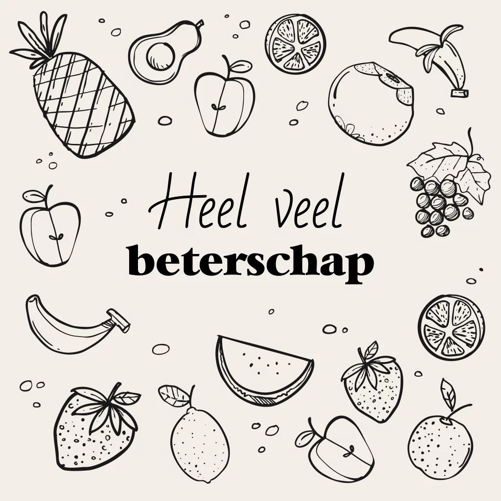 Zakelijke beterschapskaart met illustraties van fruit. Verstuurd deze wenskaart om iemand een spoedig herstel te wensen. Pas de tekst eenvoudig aan in de editor.