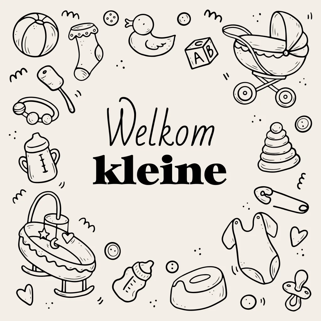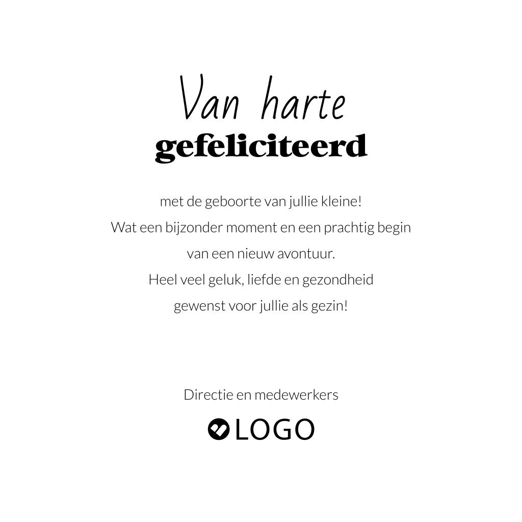 Verstuur deze zakelijke wenskaart om je werknemer of collega te feliciteren met de komst van de kleine. Op de voorzijde zie je illustratie die bij een geboorte passen zoals een wandelwagen, rompertje en fles.