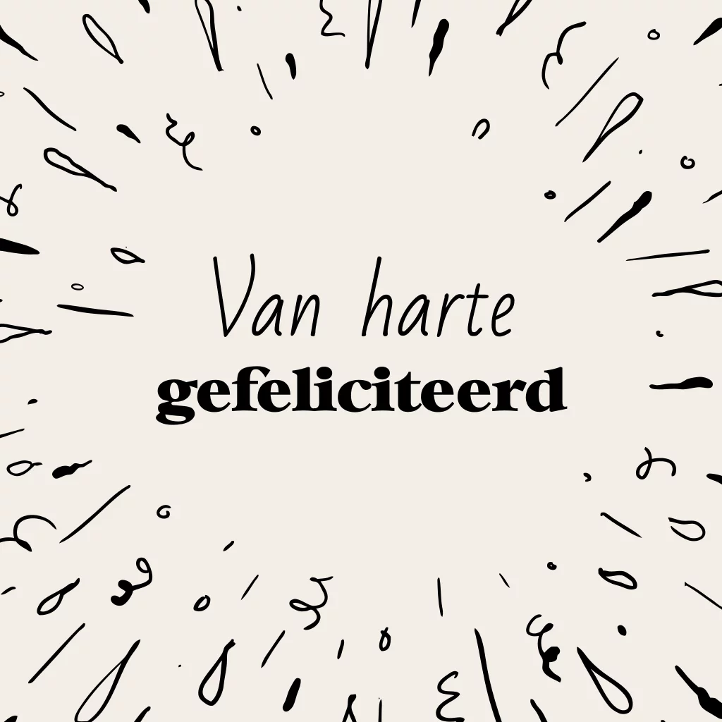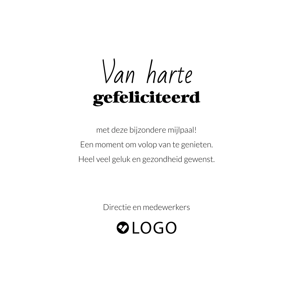 Zakelijke wenskaart om iemand te feliciteren. De wenskaart heeft neutrale beige met zwarte kleuren met confetti en de tekst 'Van harte gefeliciteerd'. Deze wenskaart kun je voor verschillende gelegenheden gebruiken, bijvoorbeeld voor een werkjubileum of wanneer iemand jarig is. De tekst is aanpasbaar, dus je kunt er iets formeels of iets leuks van maken. Het enige wat je hoeft te doen, is het logo aan te passen.