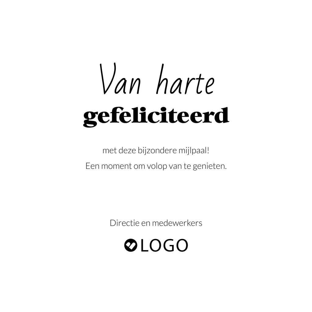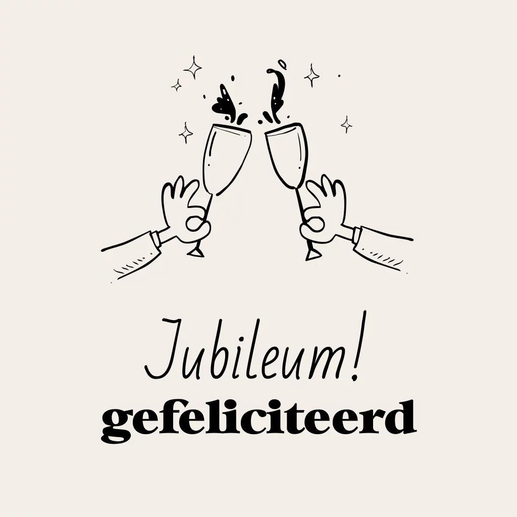 Een leuke zakelijke wenskaart met geïllustreerde proostende champagne glazen voor een zakelijk werkjubileum. De kaart heeft een rustige neutrale beige kleur met zwarte tekst. Pas deze jubileum wenskaart naar eigen wens aan in onze online editor.