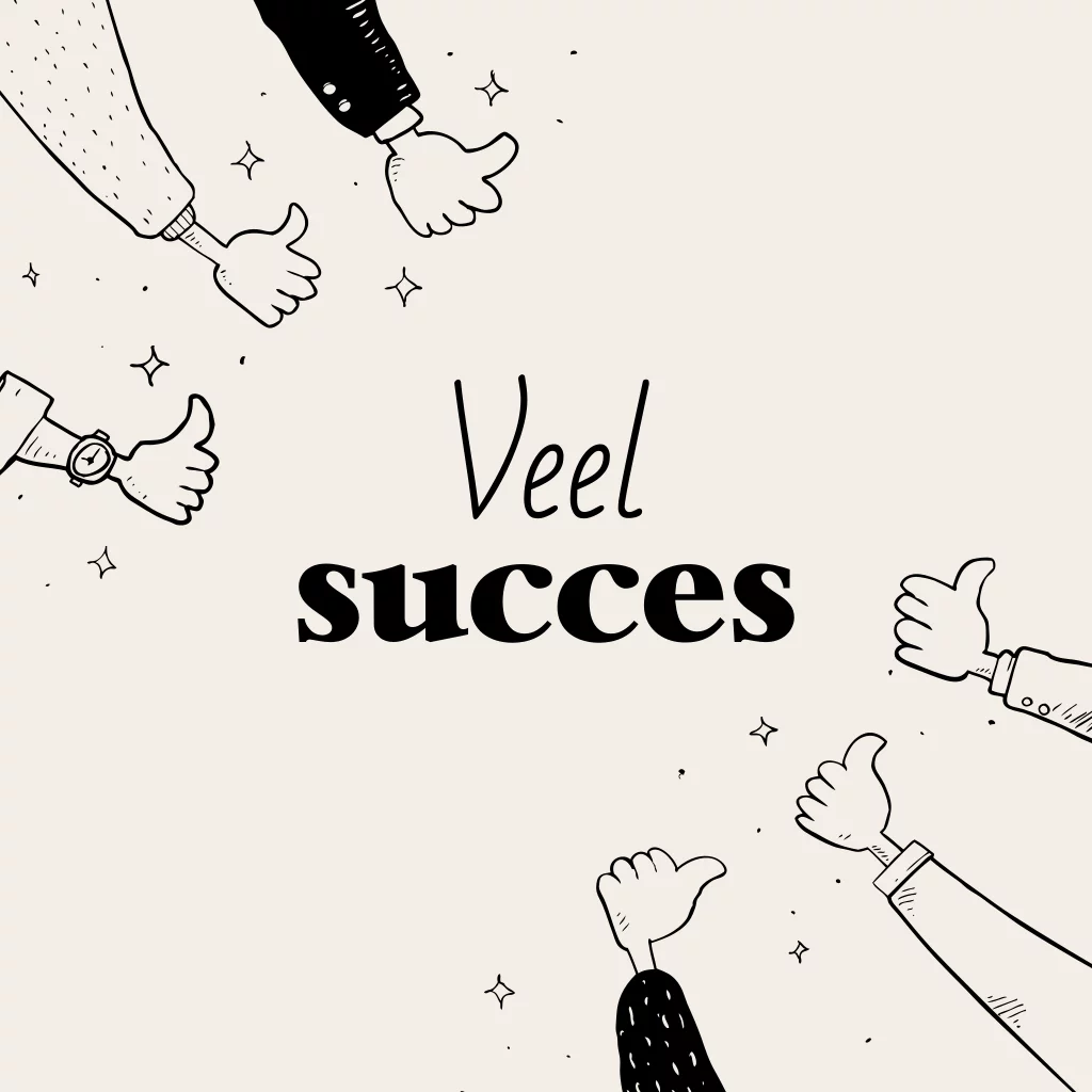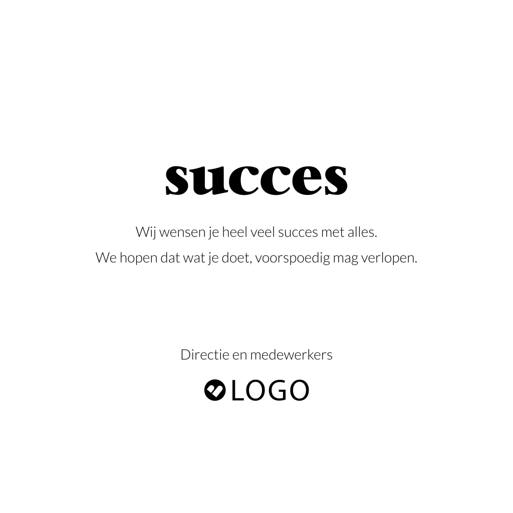 Zakelijke wenskaart om iemand heel veel succes te wensen. De kaart heeft neutrale kleuren met een illustratie van duimpjes die omhoog staan. De tekst is aanpasbaar, dus je kunt er iets formeels of iets leuks van maken.