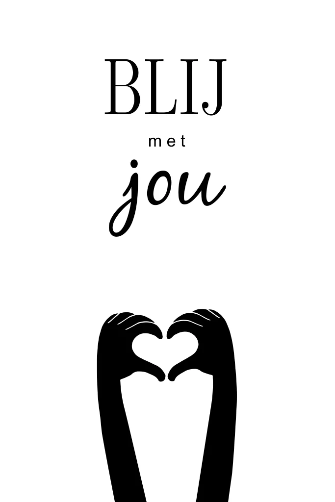 Zakelijke bedankkaart in zwart-wit met handen die het hart gebaar maken en de tekst "Blij met jou". Zo kun je op een bijzondere manier jouw medewerkers, klanten of cliënten een compliment geven. Voeg een persoonlijke tekst toe op de achterzijde. De kleuren en teksten zijn aan te passen in de editor.